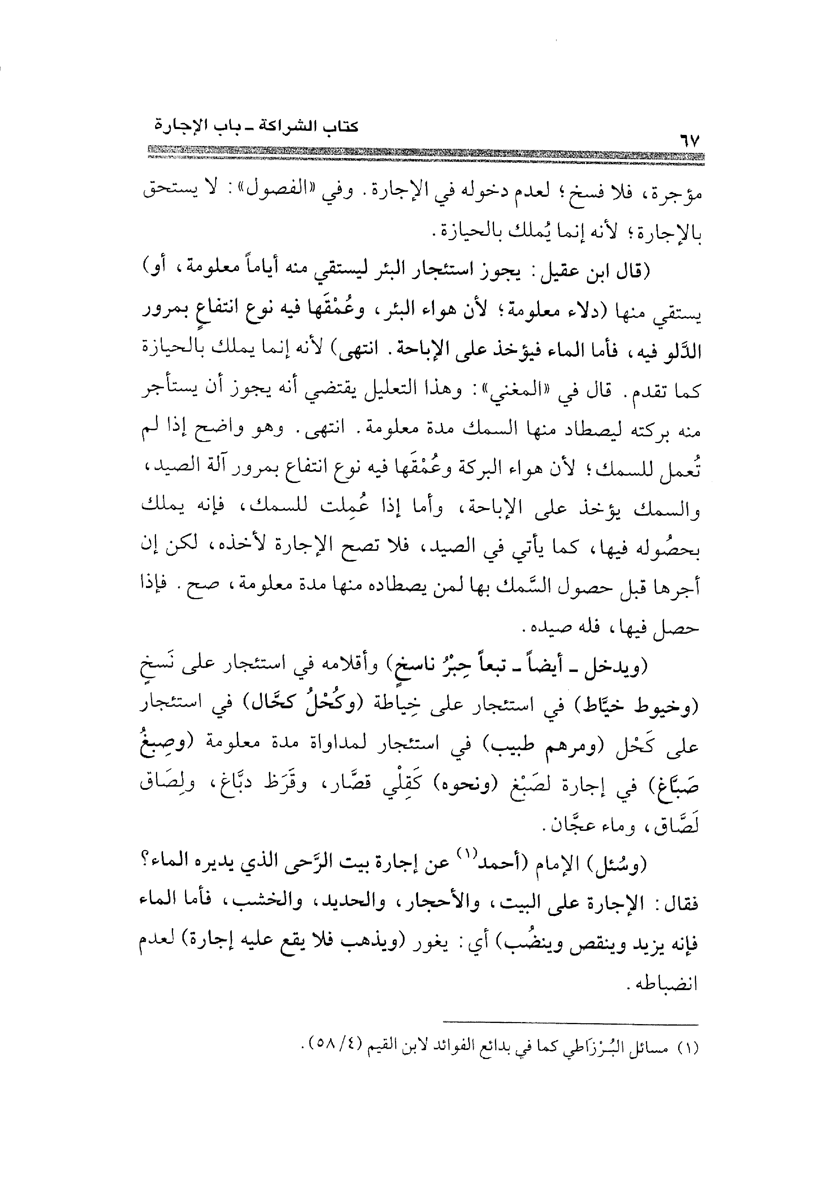 (قال ابن عقيل: يجوز استئجار البئر ليستقي منه أيامًا معلومة، أو) يستقي منها (دلاء معلومة؛ لأن هواء البئر، وعُمقَها فيه نوع انتفاع بمرور الدلو فيه، فأما الماء فيؤخذ على الإباحة. انتهى) لأنه إنما يملك بالحيازة كما تقدم. قال في (المغني): وهذا التعليل يقتضي أنه يجوز أن يستأجر منه بركته ليصطاد منها السمك مدة معلومة. انتهى. وهو واضح إذا لم تُعمل للسمك؛ لأن هواء البركة وعُمْقَها فيه نوع انتفاع بمرور آلة الصيد، والسمك يؤخذ على الإباحة، وأما إذا عملت للسمك، فإنه يملك بحصُوله فيها، كما يأتي في الصيد، فلا تصح الإجارة لأخذه، لكن إن أجرها قبل حصول السَّمك بها لمن يصطاده منها مدة معلومة، صح. فإذا حصل فيها، فله صيده.