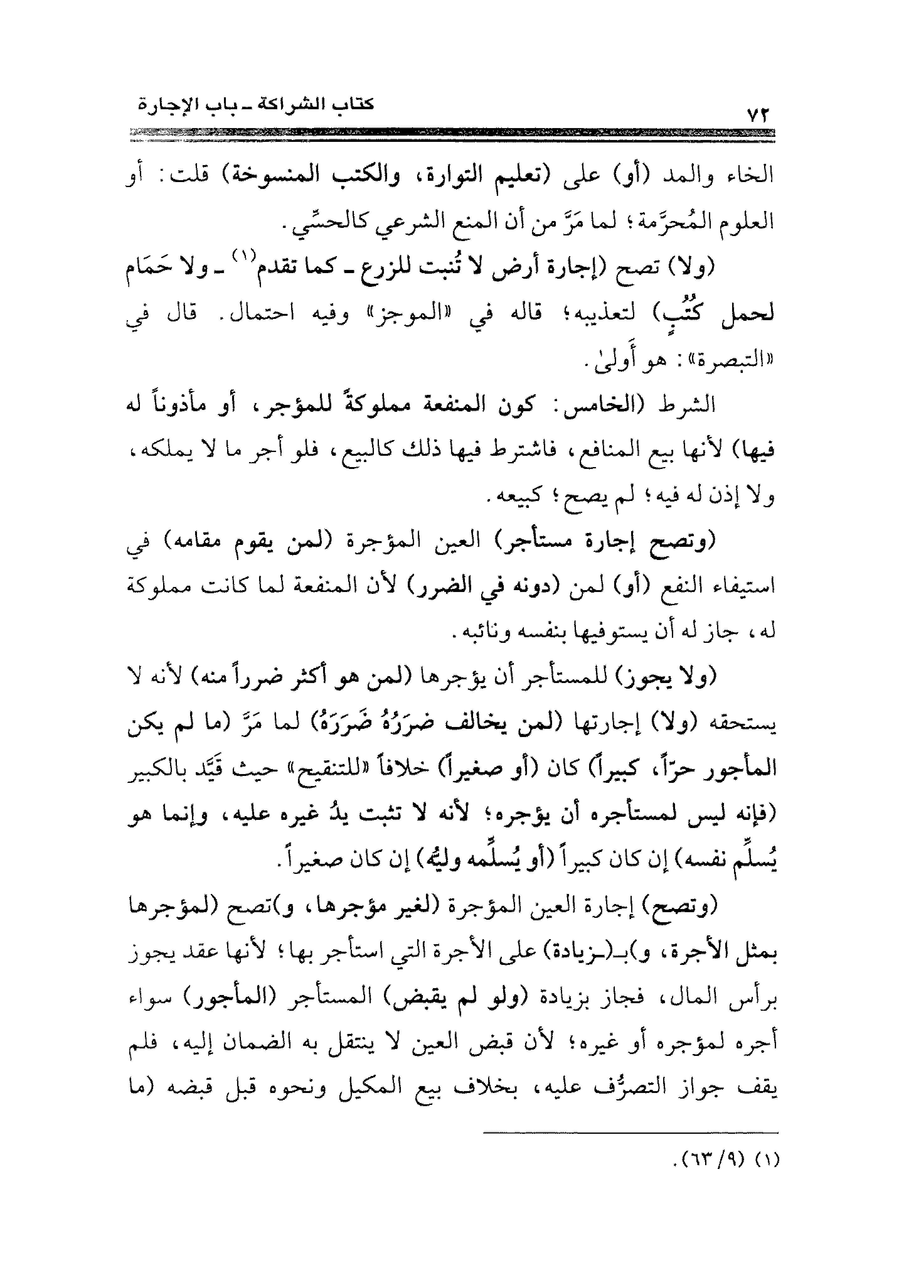 (ولا يجوز) للمستأجر أن يؤجرها (لمن هو أكثر ضررًا منه) لأنه لا يستحقه (ولا) إجارتها (لمن يخالف ضرَرُهُ ضَرَرَهُ) لما مَرَّ (ما لم يكن المأجور حرًّا، كبيرًا) كان (أو صغيرًا)، خلافًا "للتنقيح" حيث قَيَّد بالكبير (فإنه ليس لمستأجره أن يؤجره؛ لأنه لا تثبت يدُ غيره عليه، وإنما هو يسلِّم نفسه) إن كان كبيرًا (أو يسلِّمه وليُّه) إن كان صغيرًا.