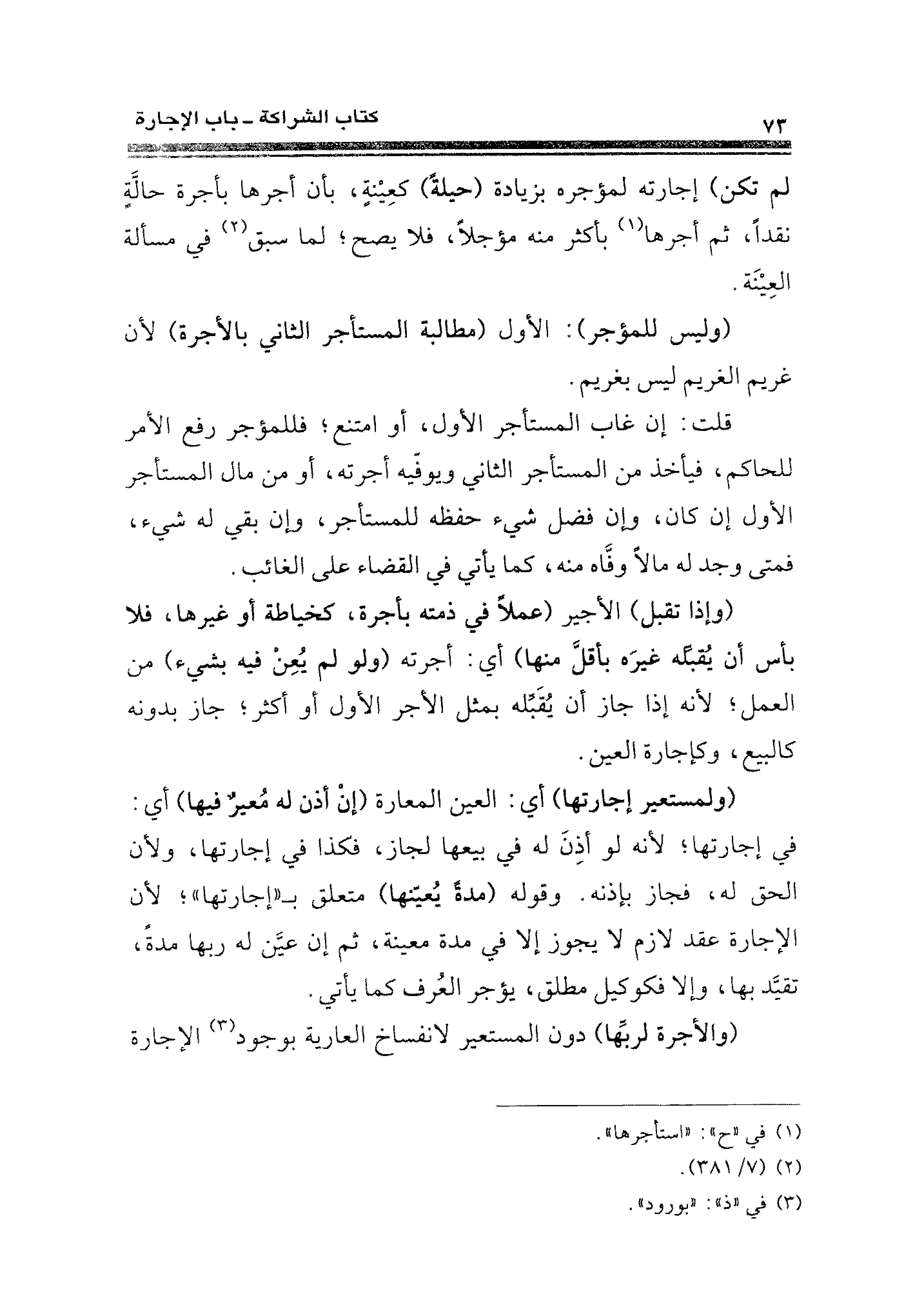 لم تكن) إجارته لمؤجره بزيادة (حيلةً) كعِينةٍ، بأن أجرها بأجرة حالَّةٍ نقدًا، ثم أجرها (¬١) بأكثر منه مؤجلًا، فلا يصح؛ لما سبق (¬٢) في مسألة العِينَة.