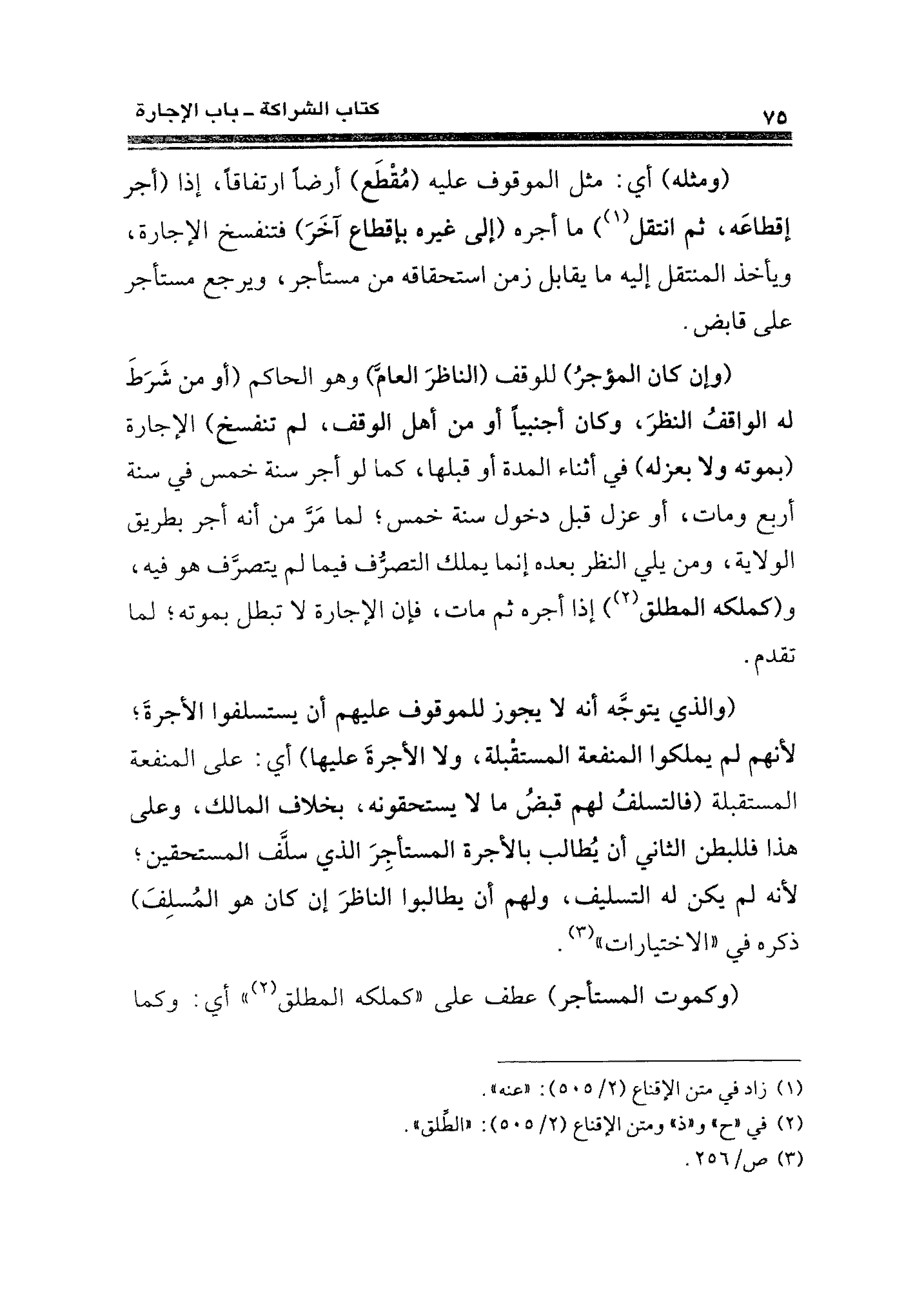 (وإن كان المؤجرُ) للوقف (الناظرَ العام) وهو الحاكم (أو من شرَطَ له الواقفُ النظرَ، وكان أجنبيًّا أو من أهل الوقف، لم تنفسخ) الإجارة (بموته ولا بعزله) في أثناء المدة أو قبلها، كما لو أجر سنة خمس في سنة أربع ومات، أو عزل قبل دخول سنة خمس؛ لما مَرَّ من أنه أجر بطريق الولاية، ومن يلي النظر بعده إنما يملك التصرُّف فيما لم يتصرف هو فيه، و (كملكه المطلق (¬٢)) إذا أجره ثم مات، فإن الإجارة لا تبطل بموته؛ لما تقدم.