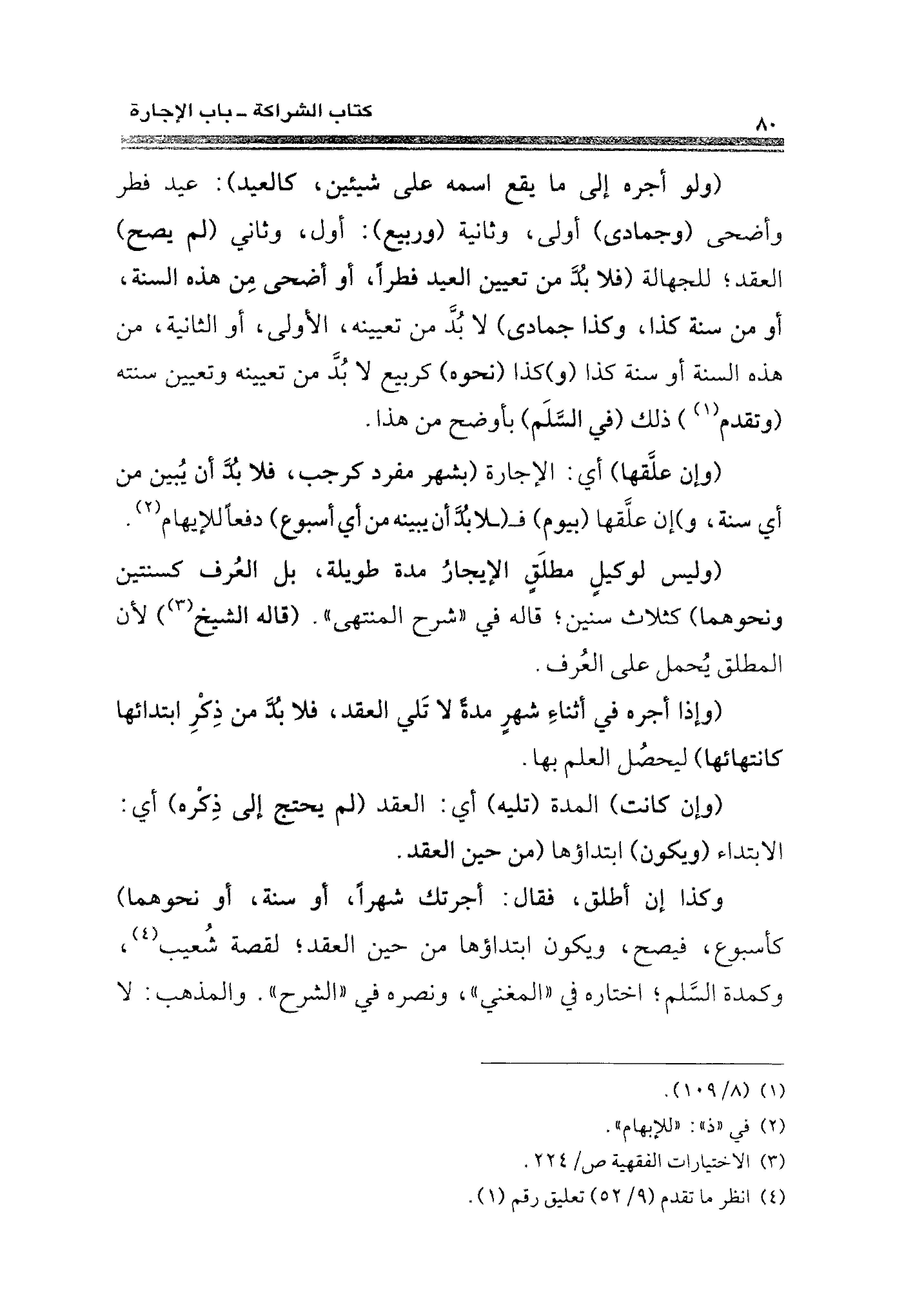 (ولو أجره إلى ما يقع اسمه على شيئين، كالعيد): عيد فطر وأضحى (وجمادى) أولى، وثانية (وربيع): أول، وثاني (لم يصح) العقد؛ للجهالة (فلا بُدَّ من تعيين العيد فطرًا، أو أضحى مِن هذه السنة، أو من سنة كذا، وكذا جمادى) لا بُدَّ من تعيينه، الأولى، أو الثانية، من هذه السنة أو سنة كذا (و) كذا (نحوه) كربيع لا بُدَّ من تعيينه وتعيين سنته (وتقدم (¬١)) ذلك (في السَّلَم) بأوضح من هذا.