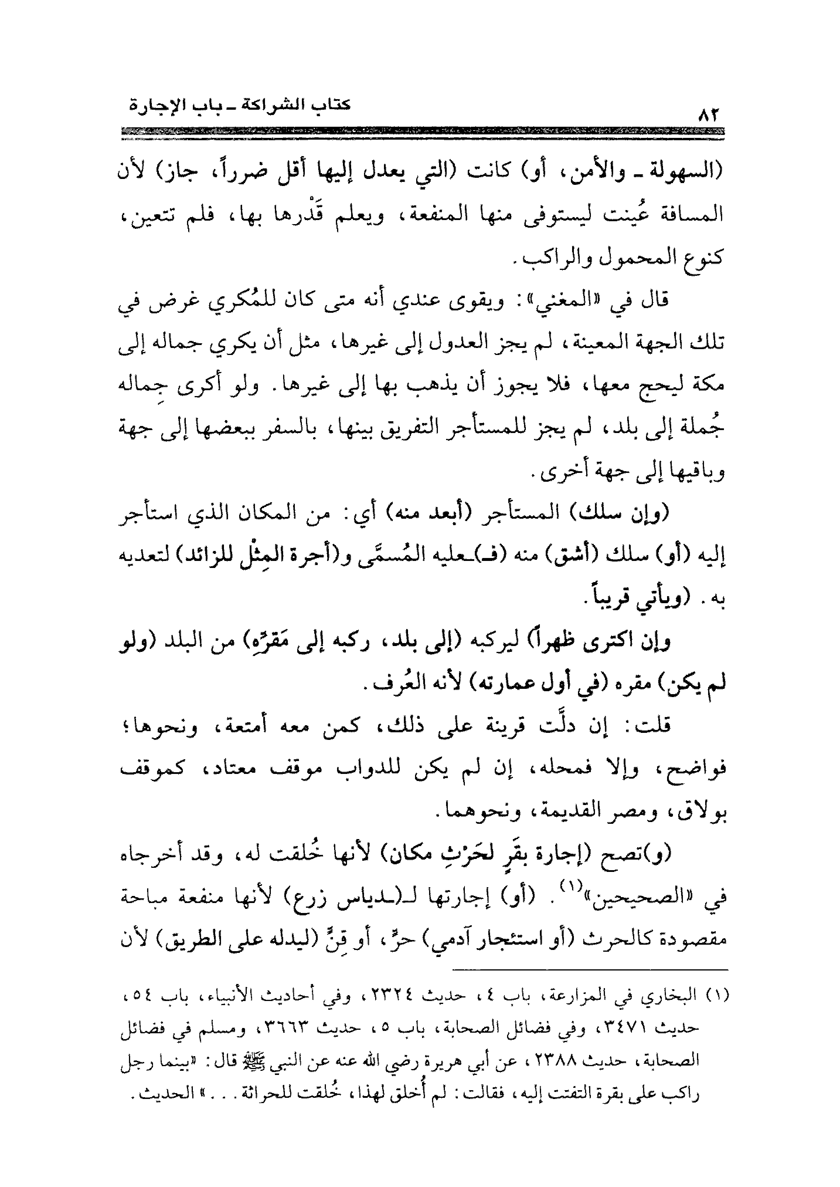 (السهولة - والأمن، أو) كانت (التي يعدل إليها أقل ضررًا، جاز) لأن المسافة عُينت لستوفى منها المنفعة، ويعلم قَدْرها بها، فلم تتعين، كنوع المحمول والراكب.