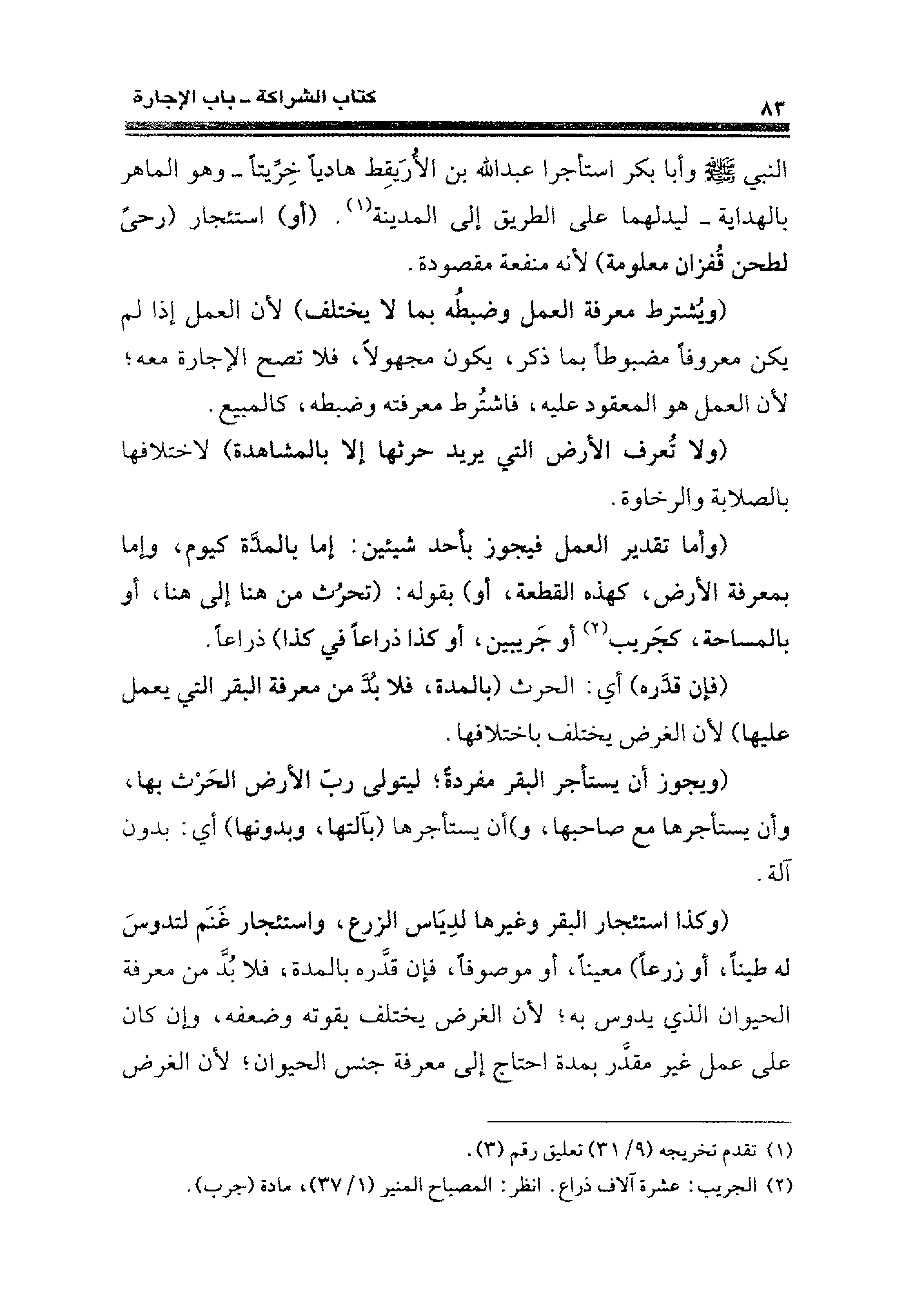 النبي - صلى الله عليه وسلم - وأبا بكر استأجرا عبد الله بن الأُريَقِط هاديًا خِرِّيتًا -وهو الماهر بالهداية- ليدلهما على الطريق إلى المدينة (¬١). (أو) استئجار (رحًى لطحن قُفزان معلومة) لأنه منفعة مقصودة.