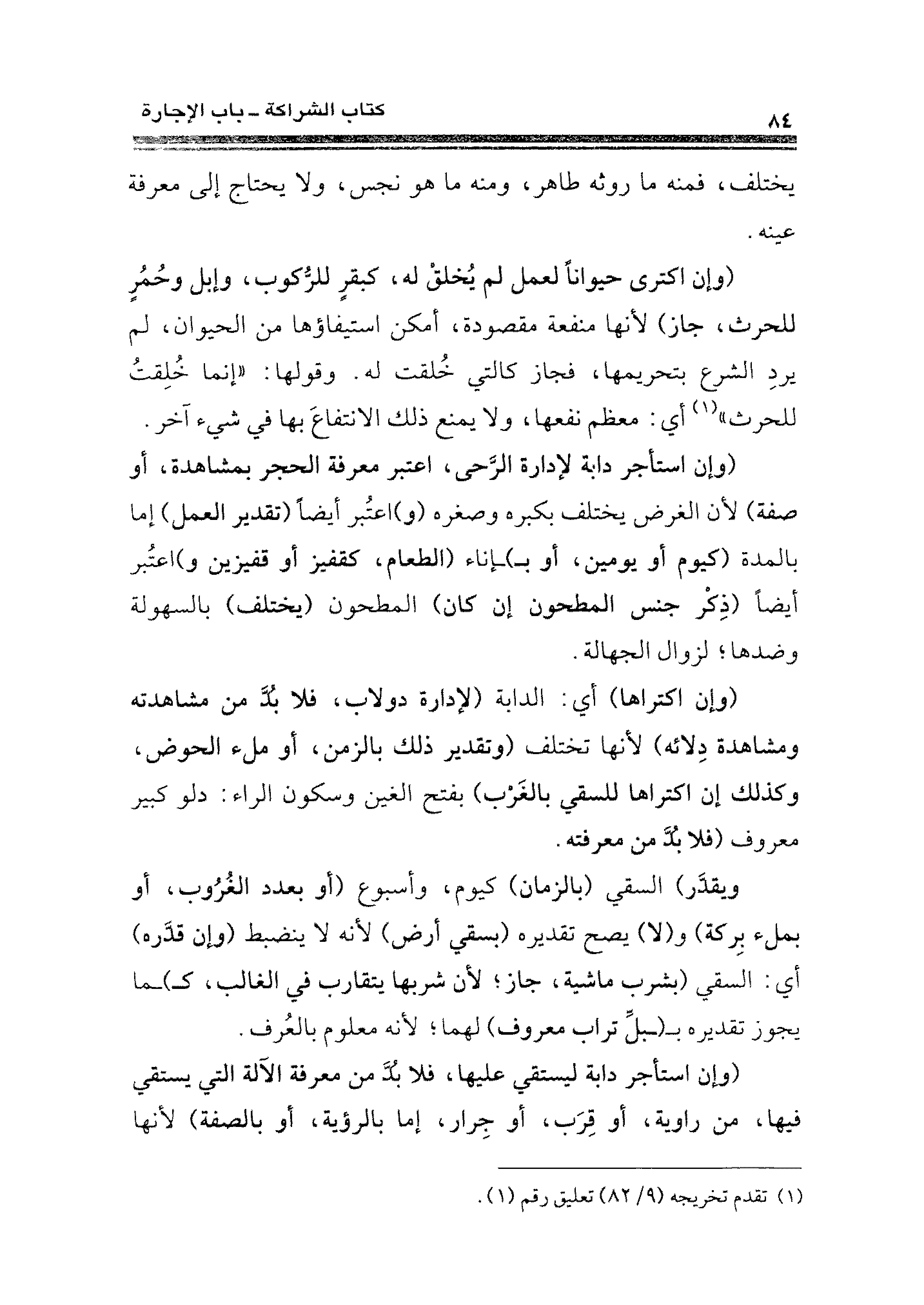 (وإن اكتراها) أي: الدابة (لإدارة دولاب، فلا بُدَّ من مشاهدته ومشاهدة دِلائه) لأنها تختلف (وتقدير ذلك بالزمن، أو ملء الحوض، وكذلك أن اكتراها للسقي بالغَرْب) بفتح الغين وسكون الراء: دلو كبير معروف (فلا بُدَّ من معرفته.