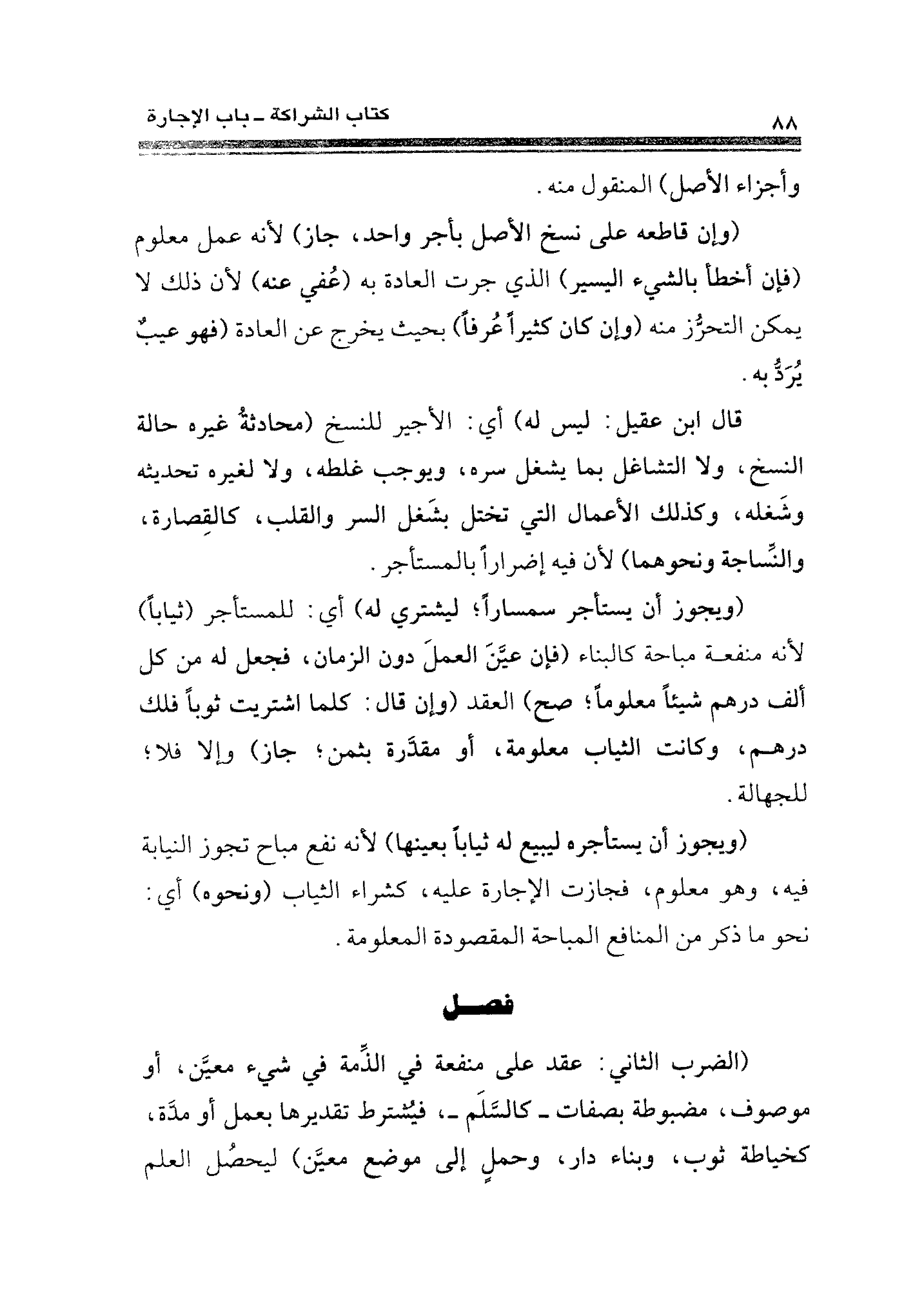 قال ابن عقيل: ليس له) أي: الأجير للنسخ (محادثةُ غيره حالة النسخ، ولا التشاغل بما يشغل سره، ويوجب غلطه، ولا لغيره تحديثه وشغله، وكذلك الأعمال التي تختل بشَغل السر والقلب، كالقِصارة، والنِّساجة ونحوهما) لأن فيه إضرارًا بالمستأجر.