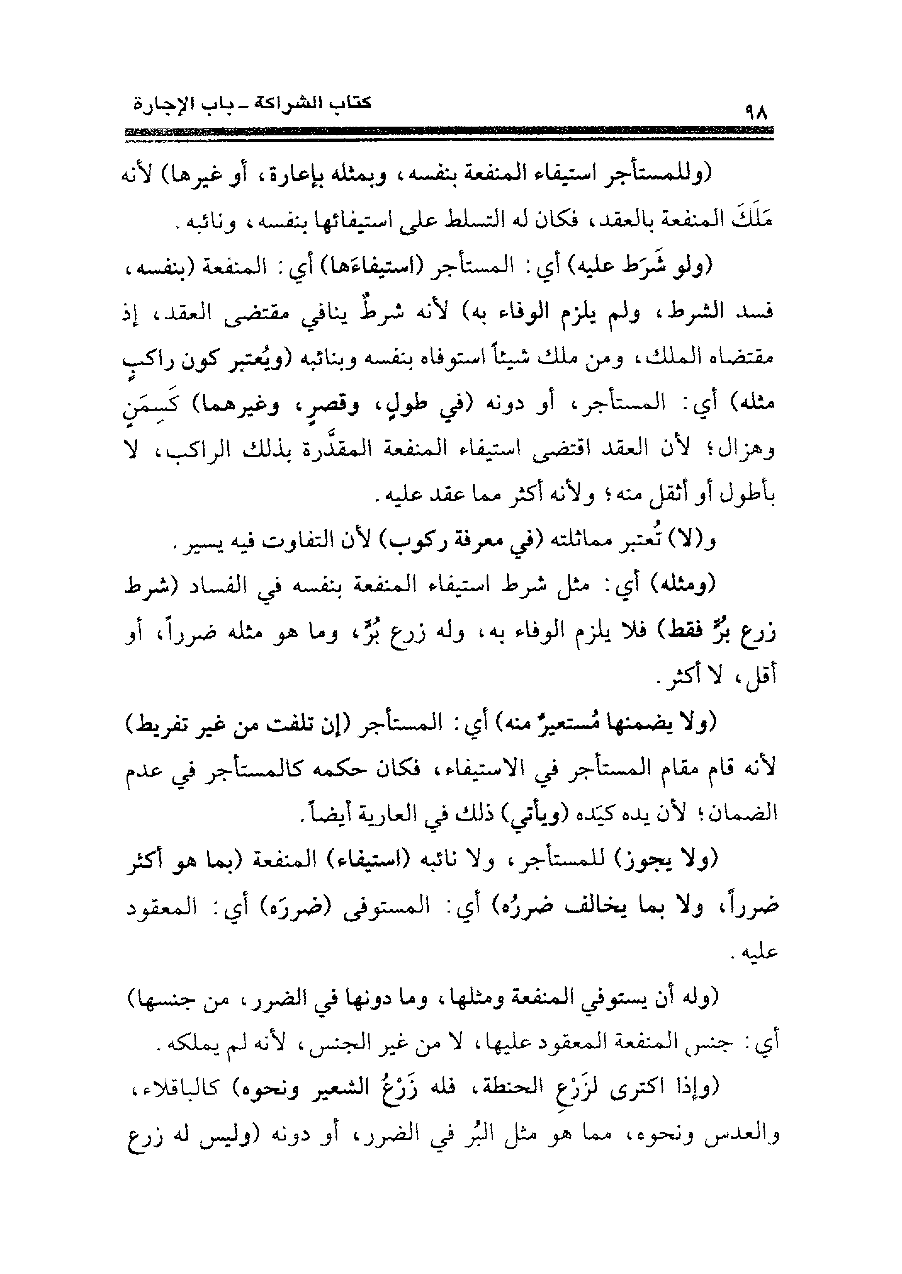 (ولو شَرَط عليه) أي: المستأجر (استيفاءَها) أي: المنفعة (بنفسه، فسد الشرط، ولم يلزم الوفاء به) لأنه شرطٌ ينافي مقتضى العقد، إذ مقتضاه الملك، ومن ملك شيئًا استوفاه بنفسه وبنائبه (ويُعتبر كون راكبٍ مثله) أي: المستأجر، أو دونه (في طولٍ، وقصرٍ، وغيرهما) كَسِمَنٍ وهزال؛ لأن العقد اقتضى استيفاء المنفعة المقدَّرة بذلك الراكب، لا بأطول أو أثقل منه؛ ولأنه أكثر مما عقد عليه.