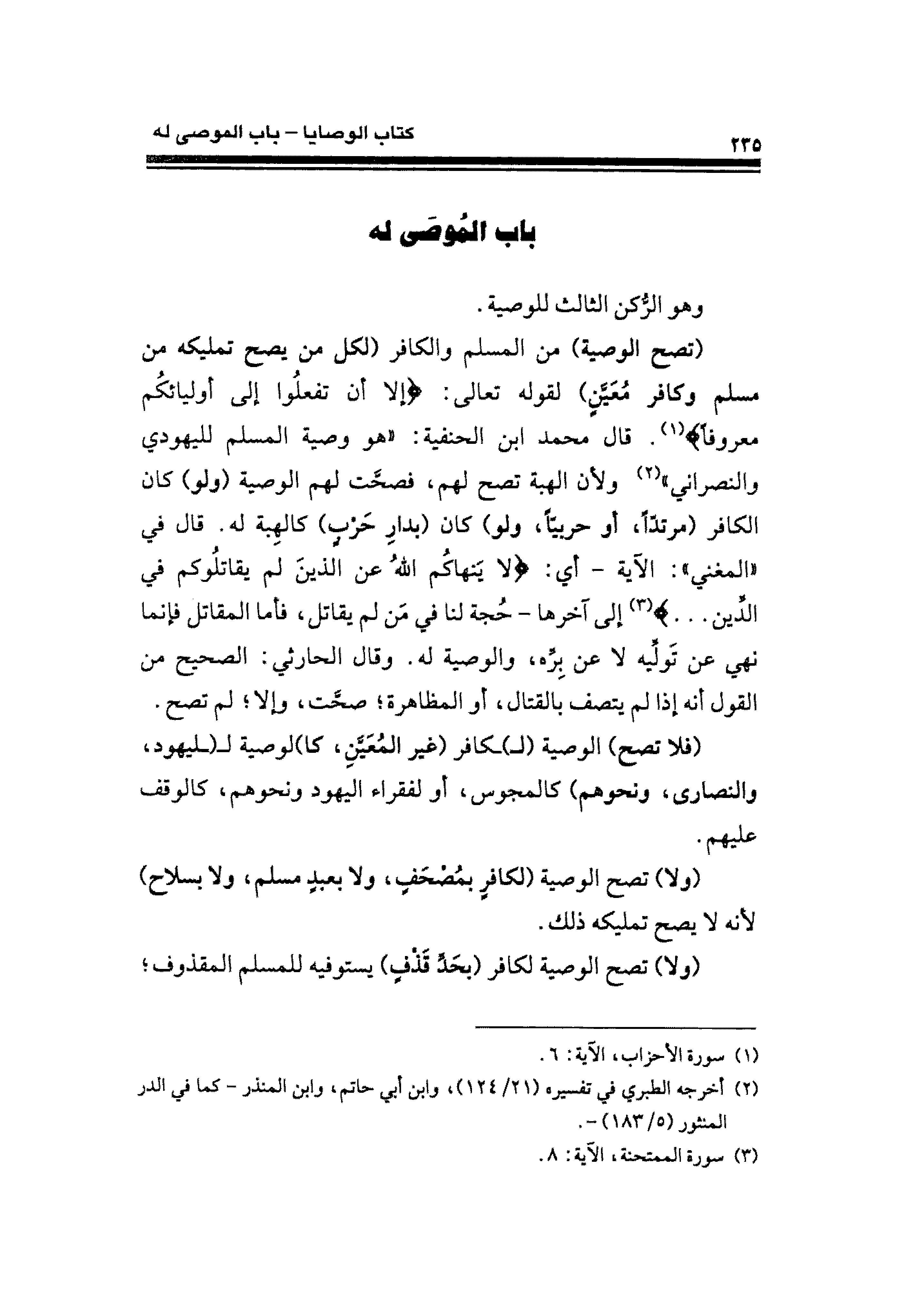 (تصح الوصية) من المسلم والكافر (لكل من يصح تمليكه من مسلم وكافر مُعَيَّنٍ) لقوله تعالى: {إلا أَنْ تَفْعَلُوا إِلَى أَوْلِيَائِكُمْ مَعْرُوفًا} (¬١). قال محمد بن الحنفية: "هو وصية المسلم لليهودي والنصراني" (¬٢) ولأن الهبة تصح لهم، فصحَّت لهم الوصية (ولو) كان الكافر (مرتدًّا، أو حربيًّا، ولو) كان (بدارِ حَرْبٍ) كالهبة له. قال في "المغني": الآية -أي: {لَا يَنْهَاكُمُ اللَّهُ عَنِ الَّذِينَ لَمْ يُقَاتِلُوكُمْ فِي الدِّينِ ... } (¬٣) إلى آخرها- حُجة لنا في مَن لم يقاتل، فأما المقاتل فإنما نهي عن تَولِّيه لا عن برِّه، والوصية له. وقال الحارثي: الصحيح من القول أنه إذا لم يتصف بالقتال، أو المظاهرة؛ صحَّت، وإلا؛ لم تصح.