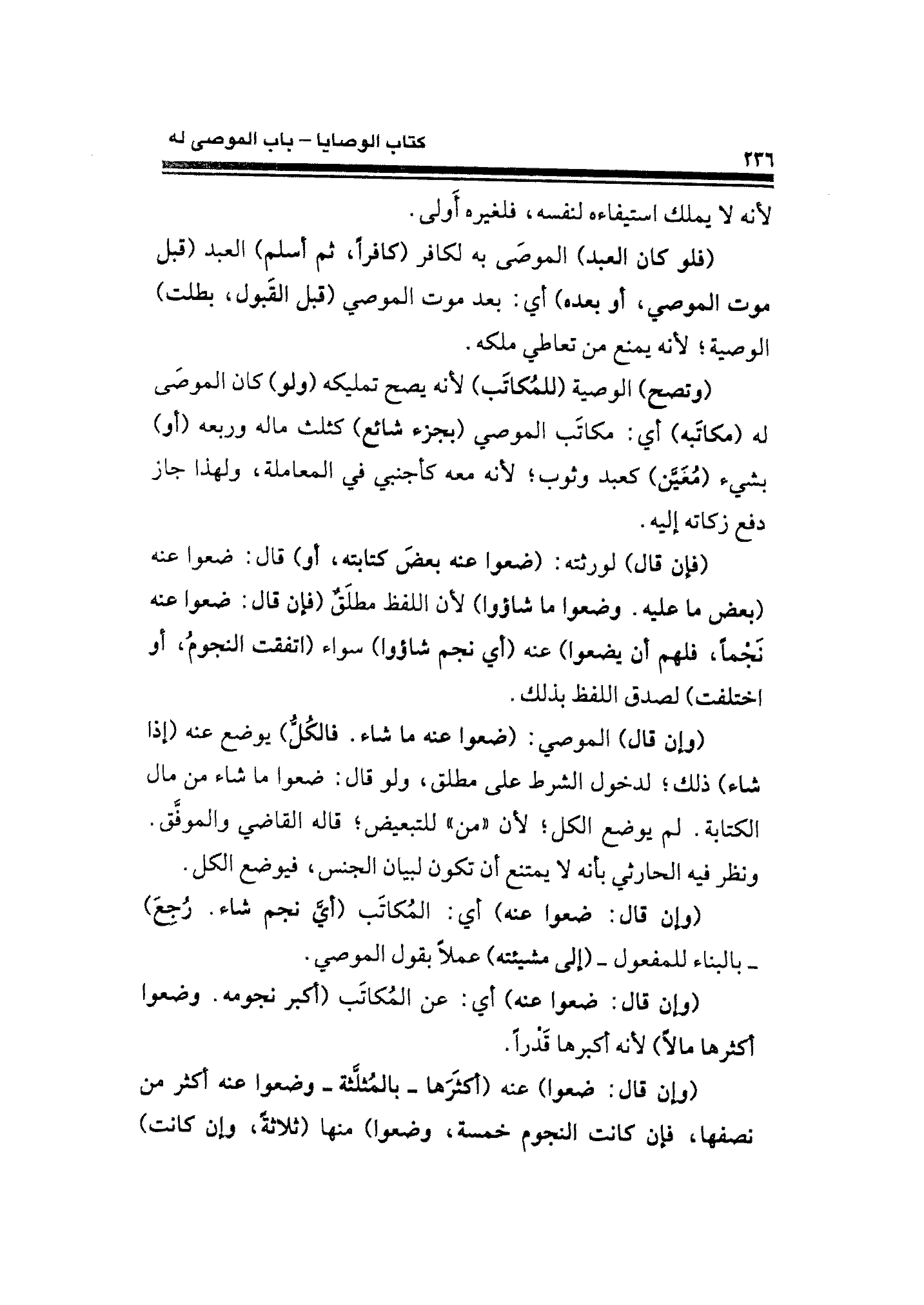 (وتصح) الوصية (للمُكاتَب) لأنه يصح تمليكه (ولو) كان الموصَى له (مكاتَبه) أي: مكاتَب الموصي (بجزء شائع) كثلث ماله وربعه (أو) بشيء (مُعَيَّن) كعبد وثوب؛ لأنه معه كأجنبي في المعاملة، ولهذا جاز دفع زكاته إليه.
