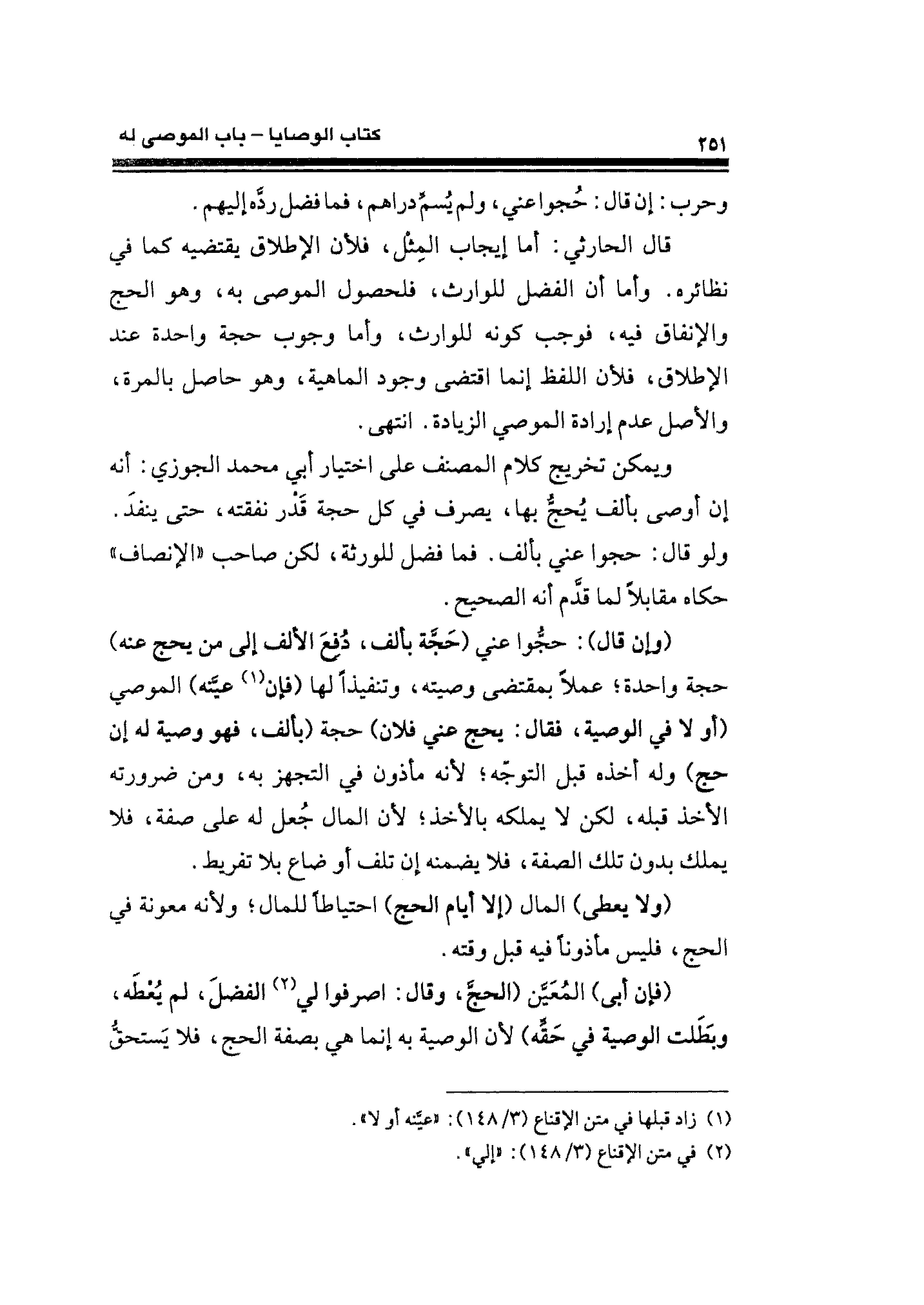 قال الحارثي: أما إيجاب المِثل، فلأن الإطلاق يقتضيه كما في نظائره. وأما أن الفضل للوارث، فلحصول الموصى به، وهو الحج والإنفاق فيه، فوجب كونه للوارث، وأما وجوب حجة واحدة عند الإطلاق، فلأن اللفظ إنما اقتضى وجود الماهية، وهو حاصل بالمرة، والأصل عدم إرادة الموصي الزيادة. انتهى.