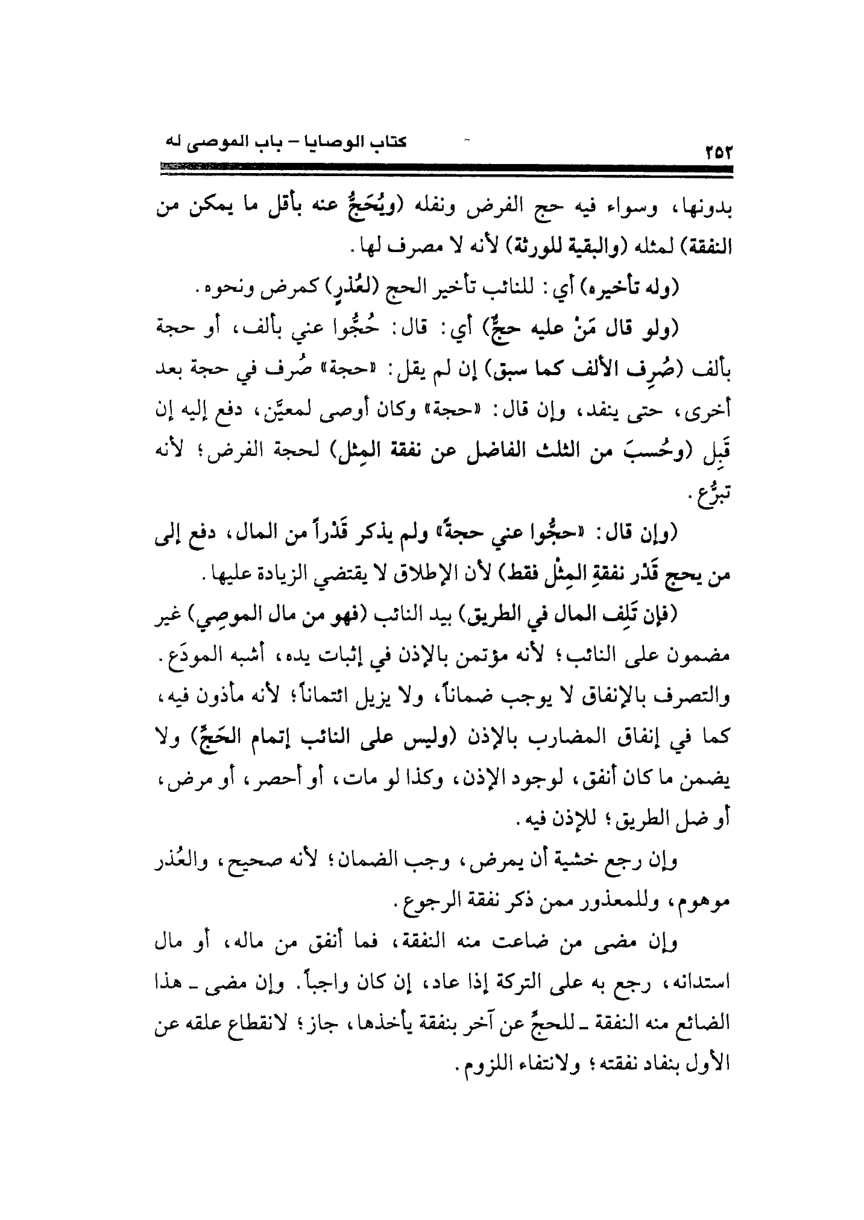 والتصرف بالإنفاق لا يوجب ضمانًا، ولا يزيل ائتمانًا؛ لأنه مأذون فيه، كما في إنفاق المضارب بالإذن (وليس على النائب إتمام الحَجِّ) ولا يضمن ما كان أنفق، لوجود الإذن، وكذا لو مات، أو أحصر، أو مرض، أو ضل الطريق؛ للإذن فيه.