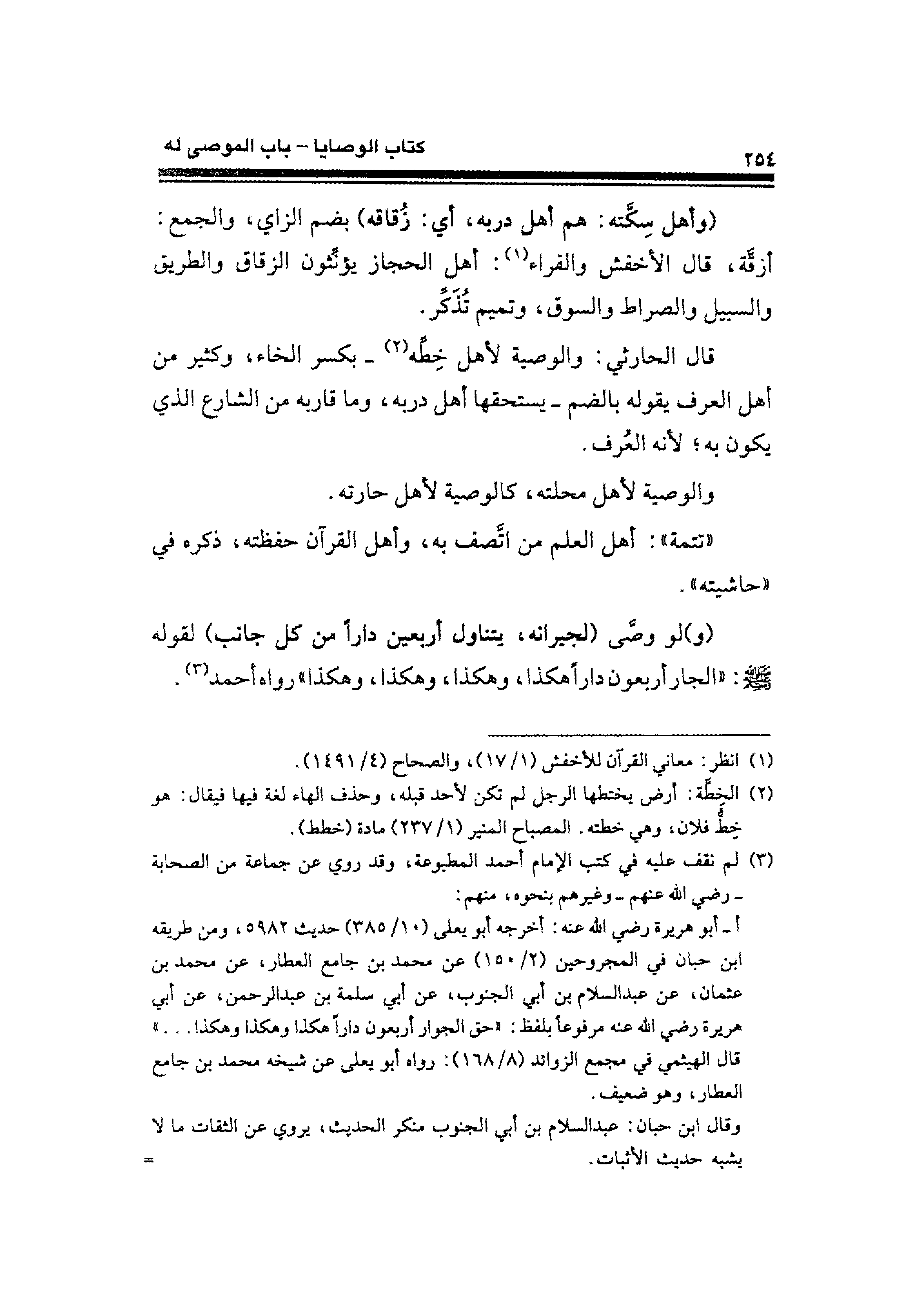 قال الحارثي: والوصية لأهل خِطِّه (¬٢) -بكسر الخاء، وكثير من أهل العرف يقوله بالضم- يستحقها أهل دربه، وما قاربه عن الشارع الذي يكون به؛ لأنه العُرف.
