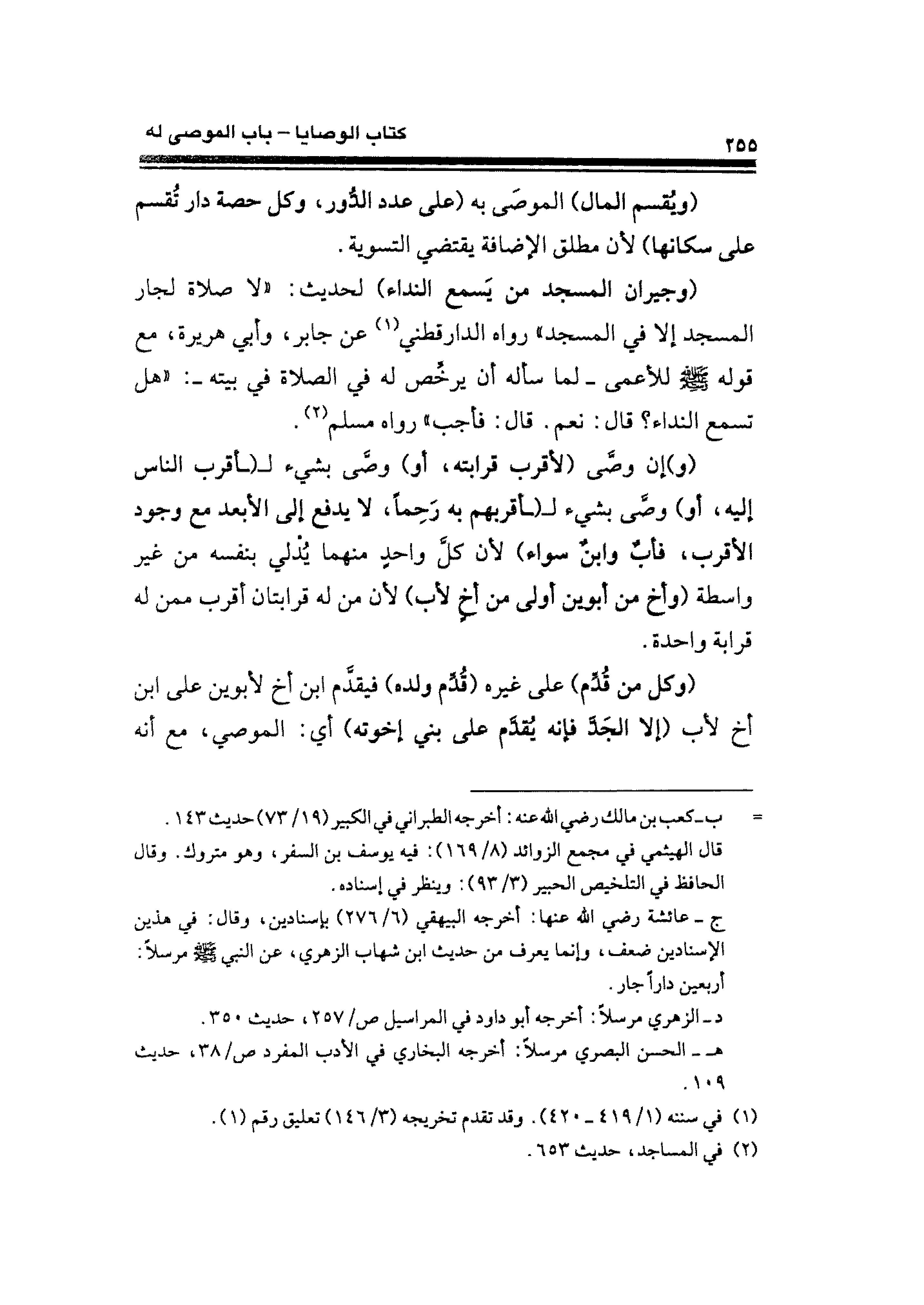 (وجيران المسجد من يَسمع النداء) لحديث: "لا صلاة لجار المسجد إلا في المسجد" رواه الدارقطني (¬١) عن جابر، وأبي هريرة، مع قوله - صلى الله عليه وسلم - للأعمى -لما سأله أن يرخِّص له في الصلاة في بيته-: "هل تسمع النداء؟ قال: نعم. قال: فأجب" رواه مسلم (¬٢).