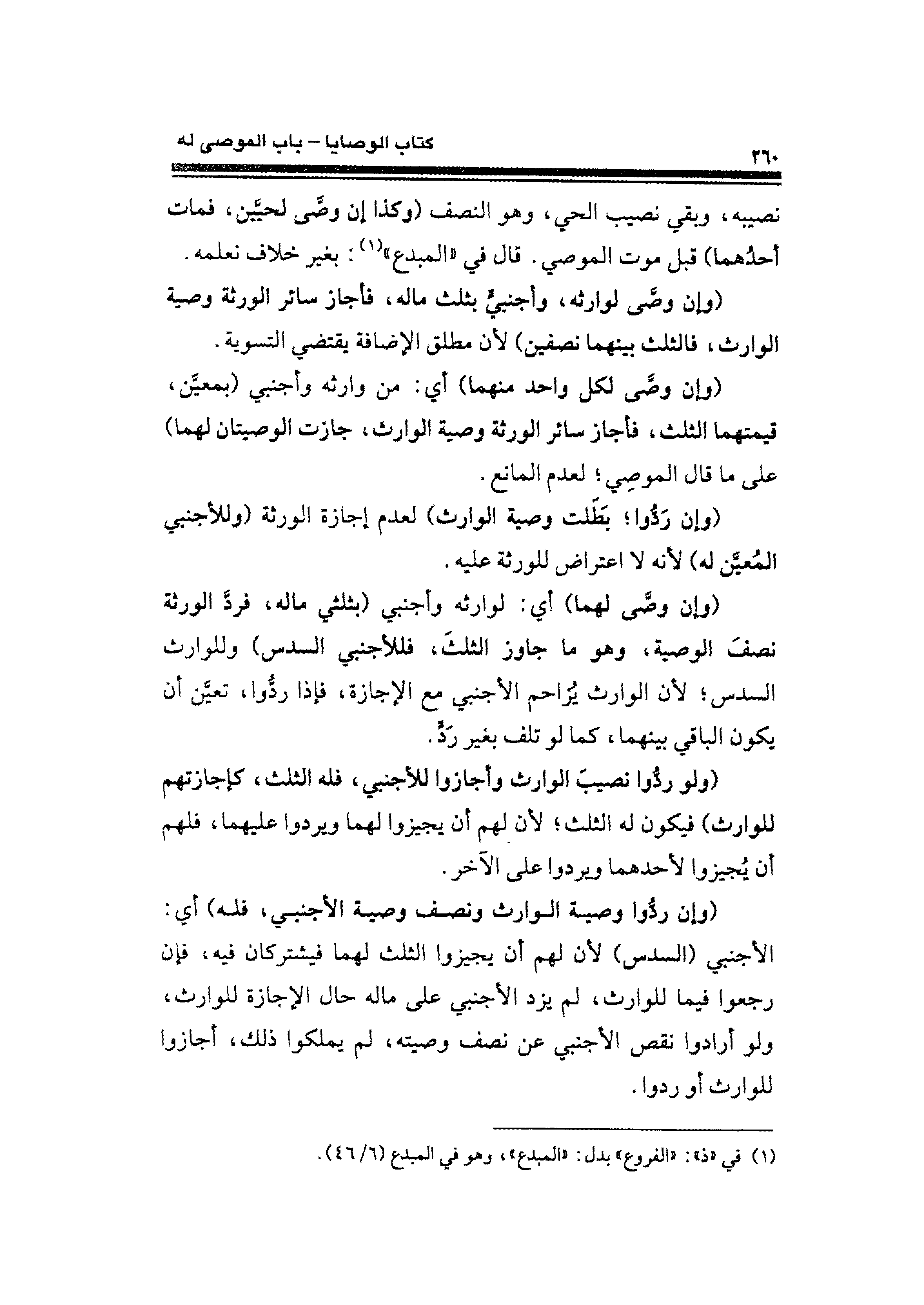 نصيبه، وبقي نصيب الحي، وهو النصف (وكذا إن وصَّى لحيَّين، فمات أحدُهما) قبل موت الموصي. قال في "المبدع" (¬١): بغير خلاف نعلمه.