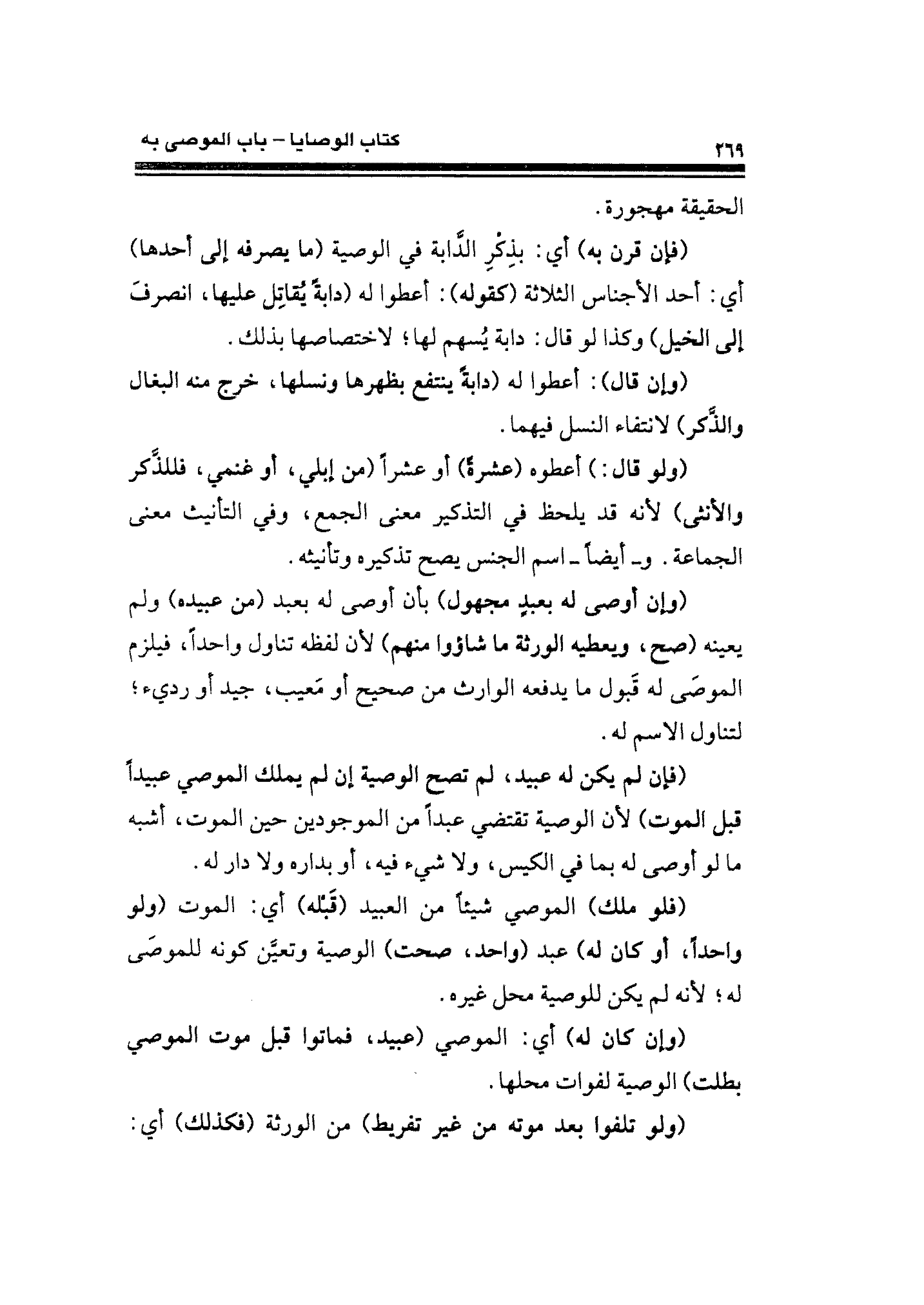 (فإن قرن به) أي: بذِكرِ الدَّابة في الوصية (ما يصرفه إلى أحدها) أي: أحد الأجناس الثلاثة (كقوله): أعطوا له (دابةً يقاتِل عليها، انصرفَ إلى الخيل) وكذا لو قال: دابة يُسهم لها؛ لاختصاصها بذلك.