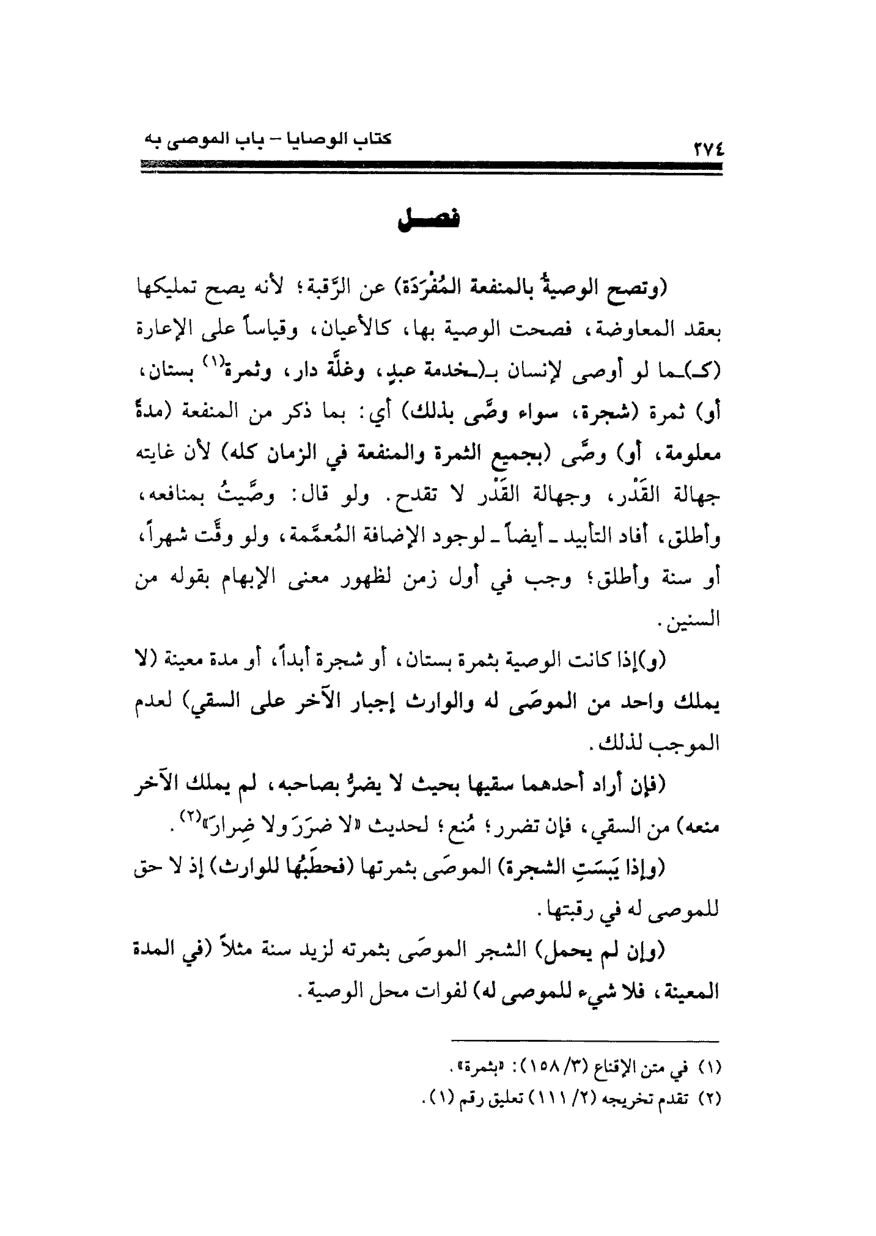 (وتصح الوصيةُ بالمنفعة المُفْرَدَة) عن الرَّقبة؛ لأنه يصح تمليكها بعقد المعاوضة، فصحت الوصية بها، كالأعيان، وقياسًا على الإعارة (كـ) ـما لو أوصى لإنسان بـ (ـخدمة عبدٍ، وغلَّة دار، وثمرة (¬١) بتان، أو) ثمرة (شجرة، سواء وصَّى بذلك) أي: بما ذكر من المنفعة (مدةً معلومة، أو) وصَّى (بجميع الثمرة والمنفعة في الزمان كله) لأن غايته جهالة القَدْر، وجهالة القَدْر لا تقدح. ولو قال: وصَّيتُ بمنافعه، وأطلق، أفاد التأبيد -أَيضًا- لوجود الإضافة المُعمَّمة، ولو وقَّت شهرًا، أو سنة وأطلق؛ وجب في أول زمن لظهور معنى الإبهام بقوله عن السنين.