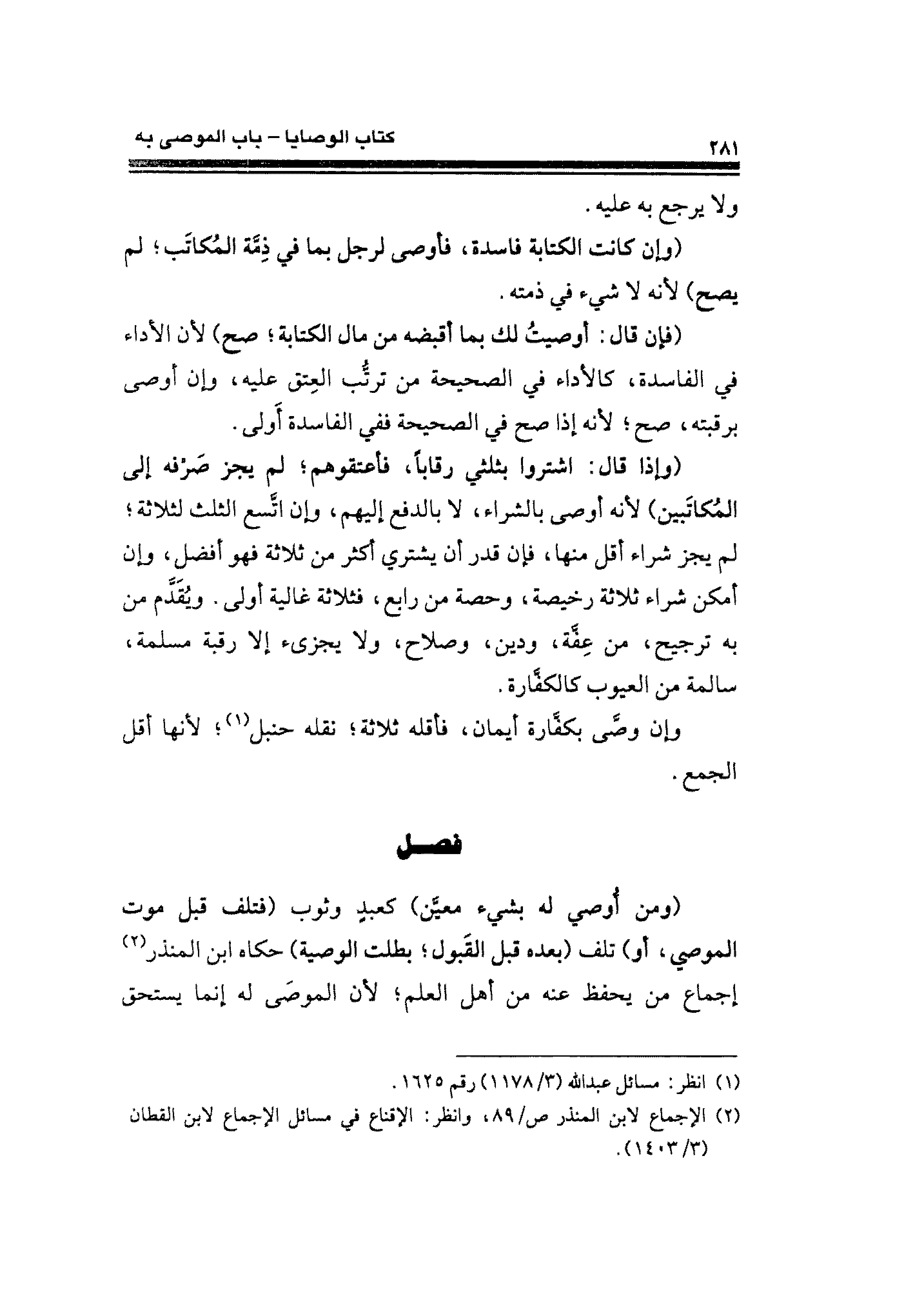 (وإذا قال: اشتروا بثلثي رقابًا، فأعتقوهم؛ لم يجز صَرْفه إلى المُكاتَبين) لأنه أوصى بالشراء، لا بالدفع إليهم، وإن اتَّسع الثلث لثلاثة؛ لم يجز شراء أقل منها، فإن قدر أن يشتري أكثر من ثلاثة فهو أفضل، وإن أمكن شراء ثلاثة رخيصة، وحصة من رابع، فثلاثة غالية أولى. ويُقَدَّم من به ترجيح، من عِفَّة، ودين، وصلاح، ولا يجزئ إلا رقبة مسلمة، سالمة من العيوب كالكفَّارة.