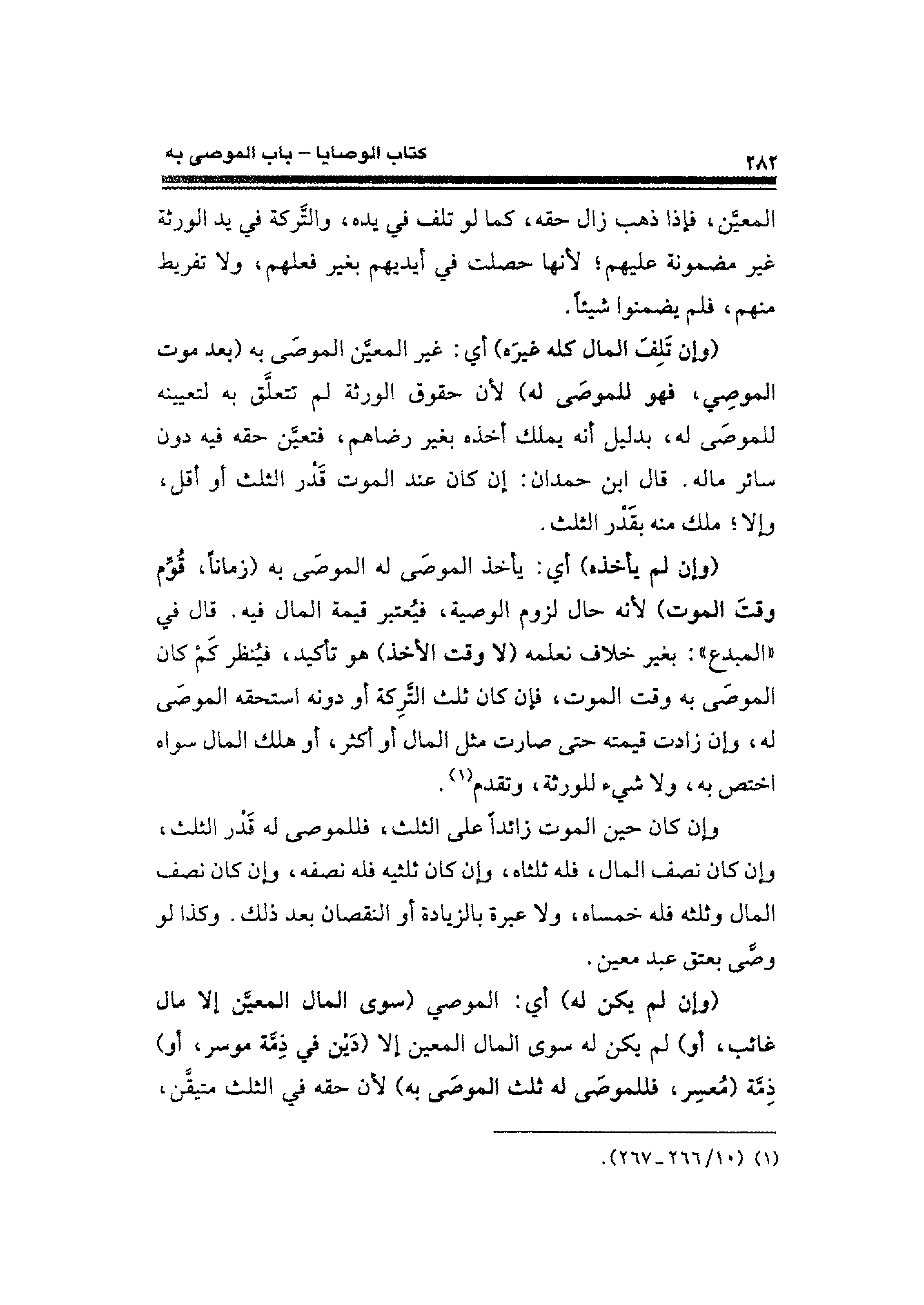 (وإن تَلِفَ المال كله غيرَه) أي: غير المعيَّن الموصَى به (بعد موت الموصِي، فهو للموصَى له) لأن حقوق الورثة لم تتعلَّق به لتعيينه للموصى له، بدليل أنه يملك أخذه بغير رضاهم، فتعيَّن حقه فيه دون سائر ماله. قال ابن حمدان: إن كان عند الموت قَدْر الثلث أو أقل، وإلا؛ ملك منه بقَدْر الثلث.