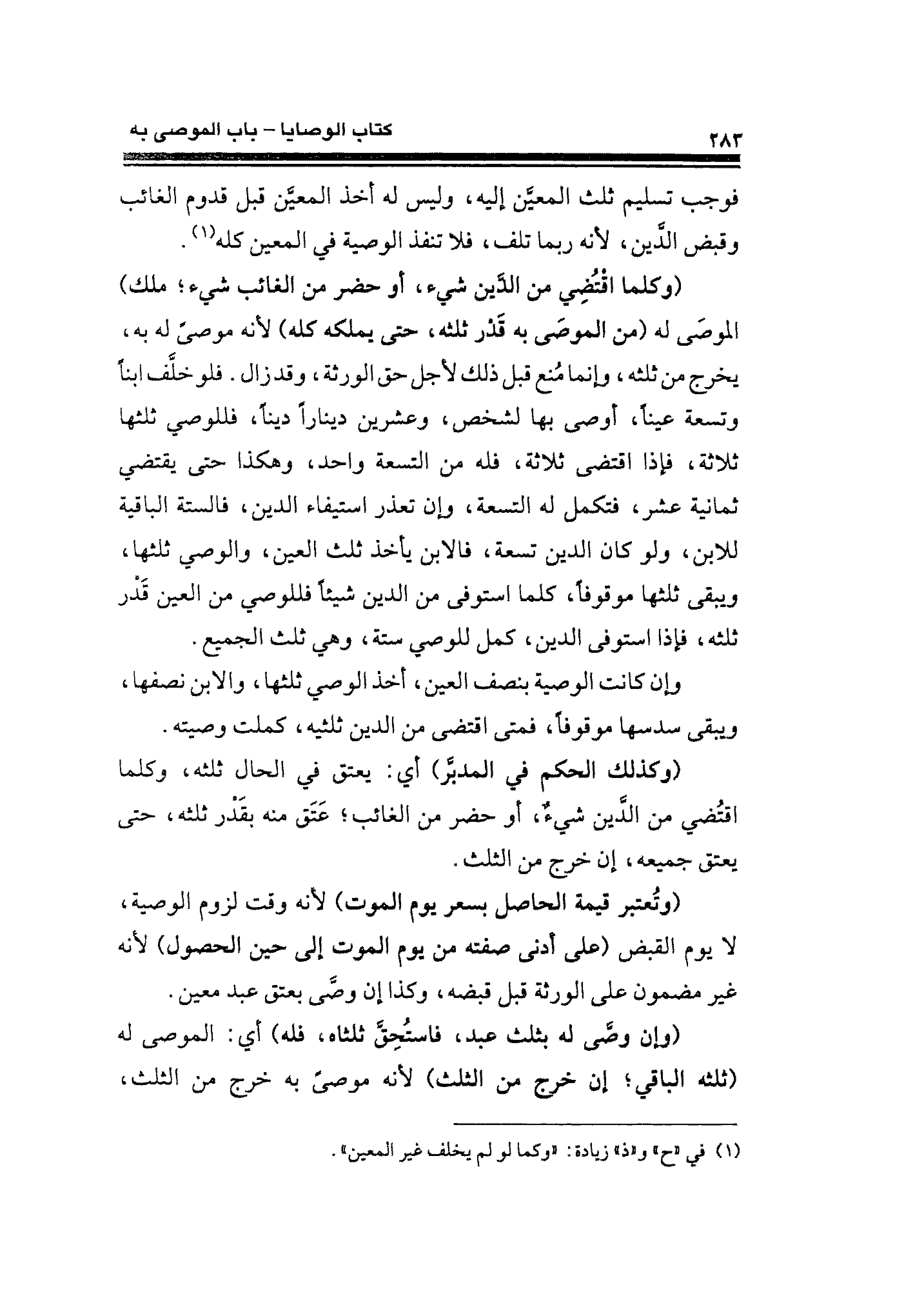 (وكلما اقْتُضِي من الدَّين شيء، أو حضر من الغائب شيء؛ ملك) الموصَى له (من الموصَى به قَدْر ثلثه، حتى يملكه كله) لأنه موصًى له به، يخرج من ثلثه، وإنما مُنع قبل ذلك لأجل حق الورثة، وقد زال. فلو خلَّف ابنًا وتسعة عينًا، أوصى بها لشخص، وعشرين دينارًا دينًا، فللوصي ثلثها ثلاثة، فإذا اقتضى ثلاثة، فله من التسعة واحد، وهكذا حتى يقتضي ثمانية عشر، فتكمل له التسعة، وإن تعذر استيفاء الدين، فالستة الباقية للابن، ولو كان الدين تسعة، فالابن يأخذ ثلث العين، والوصي ثلثها، ويبقى ثلثها موقوفًا، كلما استوفى من الدين شيئًا فللوصي من العين قَدْر ثلثه، فإذا استوفى الدين، كمل للوصي ستة، وهي ثلث الجميع.