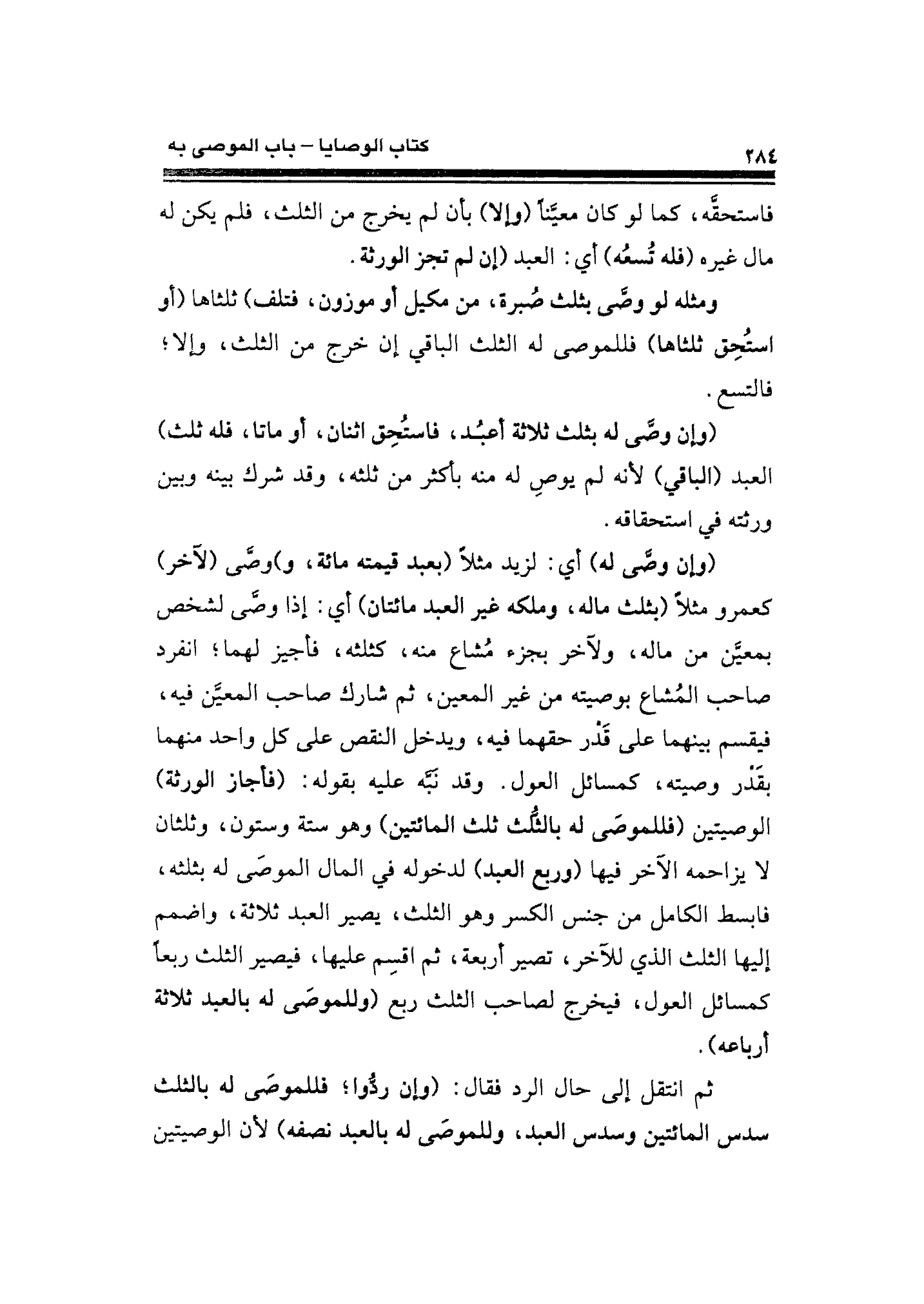(وإن وصَّى له) أي: لزيد مثلًا (بعبد قيمته مائة، و) وصَّى (لآخر) كعمرو مثلًا (بثلث ماله، وملكه غير العبد مائتان) أي: إذا وصَّى لشخص بمعيَّن عن ماله، ولآخر بجزء مُشاع منه، كثلثه، فأجيز لهما؛ انفرد صاحب المُشاع بوصيته من غير المعين، ثم شارك صاحب المعيَّن فيه، فيقسم بينهما على قَدْر حقهما فيه، ويدخل النقص على كل واحد منهما بقَدْر وصيته، كمسائل العول. وقد نَبَّه عليه بقوله: (فأجاز الورثة) الوصيتين (فللموصَى له بالثُّلث ثلث المائتين) وهو ستة وستون، وثلثان لا يزاحمه الآخر فيها (وربع العبد) لدخوله في المال الموصَى له بثلثه، فابسط الكامل من جنس الكسر وهو الثلث، يصير العبد ثلاثة، واضمم إليها الثلث الذي للآخر، تصير أربعة، ثم اقسِم عليها، فيصير الثلث ربعًا كمسائل العول، فيخرج لصاحب الثلث ربع (وللموصَى له بالعبد ثلاثة أرباعه).