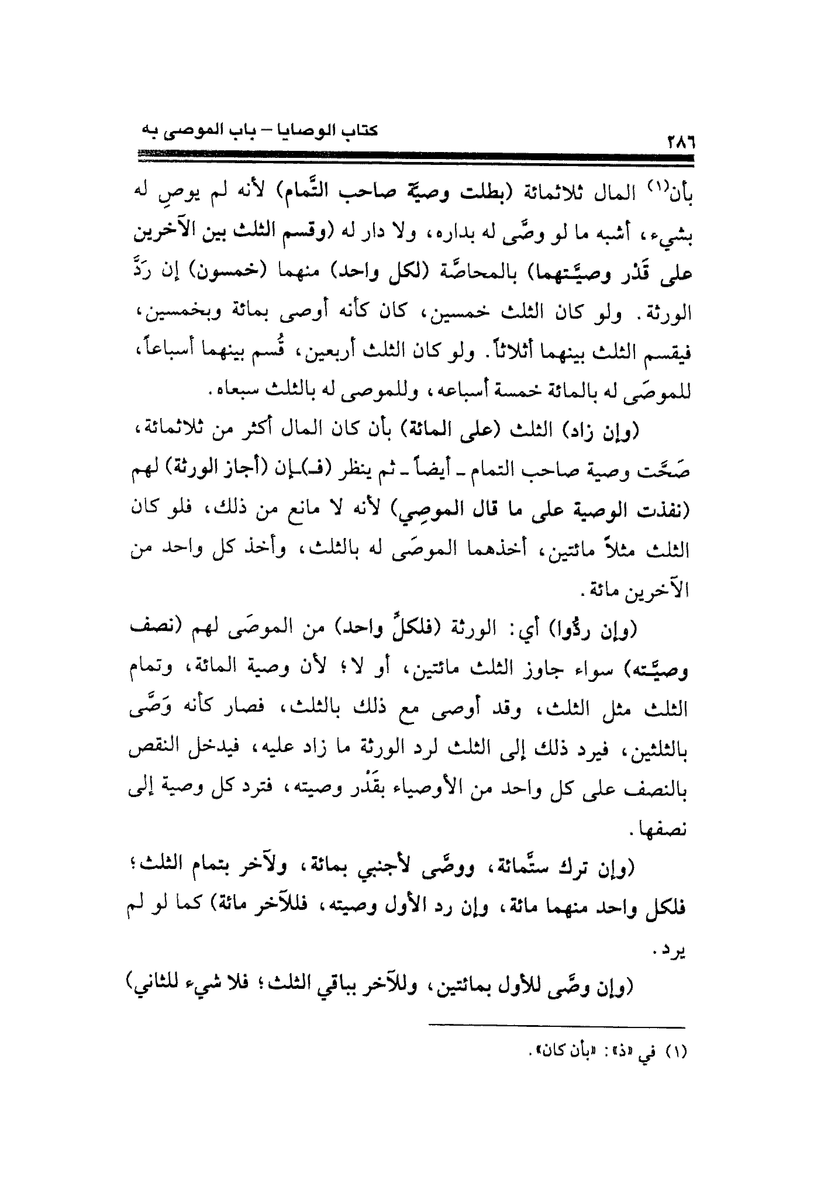 بأن (¬١) المال ثلاثمائة (بطلت وصيَّة صاحب التَّمام) لأنه لم يوصِ له بشيء، أشبه ما لو وصَّى له بداره، ولا دار له (وقسم الثلث بين الآخرين على قَدْر وصيَّتهما) بالمحاصَّة (لكل واحد) منهما (خمسون) إن رَدَّ الورثة. ولو كان الثلث خمسين، كان كأنه أوصى بمائة وبخمسين، فيقسم الثلث بينهما أثلاثًا. ولو كان الثلث أربعين، قُسم بينهما أسباعًا، للموصَى له بالمائة خمسة أسباعه، وللموصى له بالثلث سبعاه.