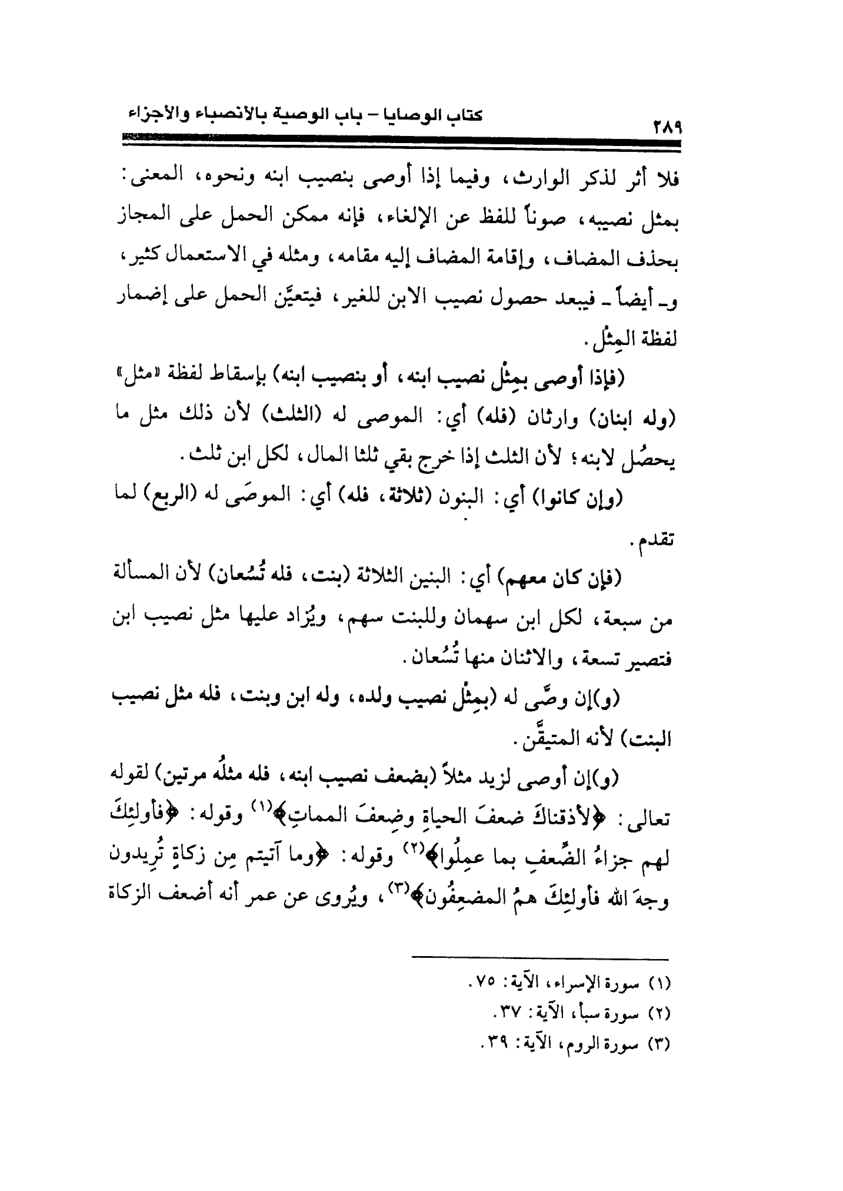فلا أثر لذكر الوارث، وفيما إما أوصى بنصيب ابنه ونحوه، المعنى: بمثل نصيبه، صونًا للفظ عن الإلغاء، فإنه ممكن الحمل على المجاز بحذف المضاف، وإقامة المضاف إليه مقامه، ومثله في الاستعمال كثير، و-أيضًا- فيبعد حصول نصيب الابن للغير، فيتعيَّن الحمل على إضمار لفظة المِثْل.