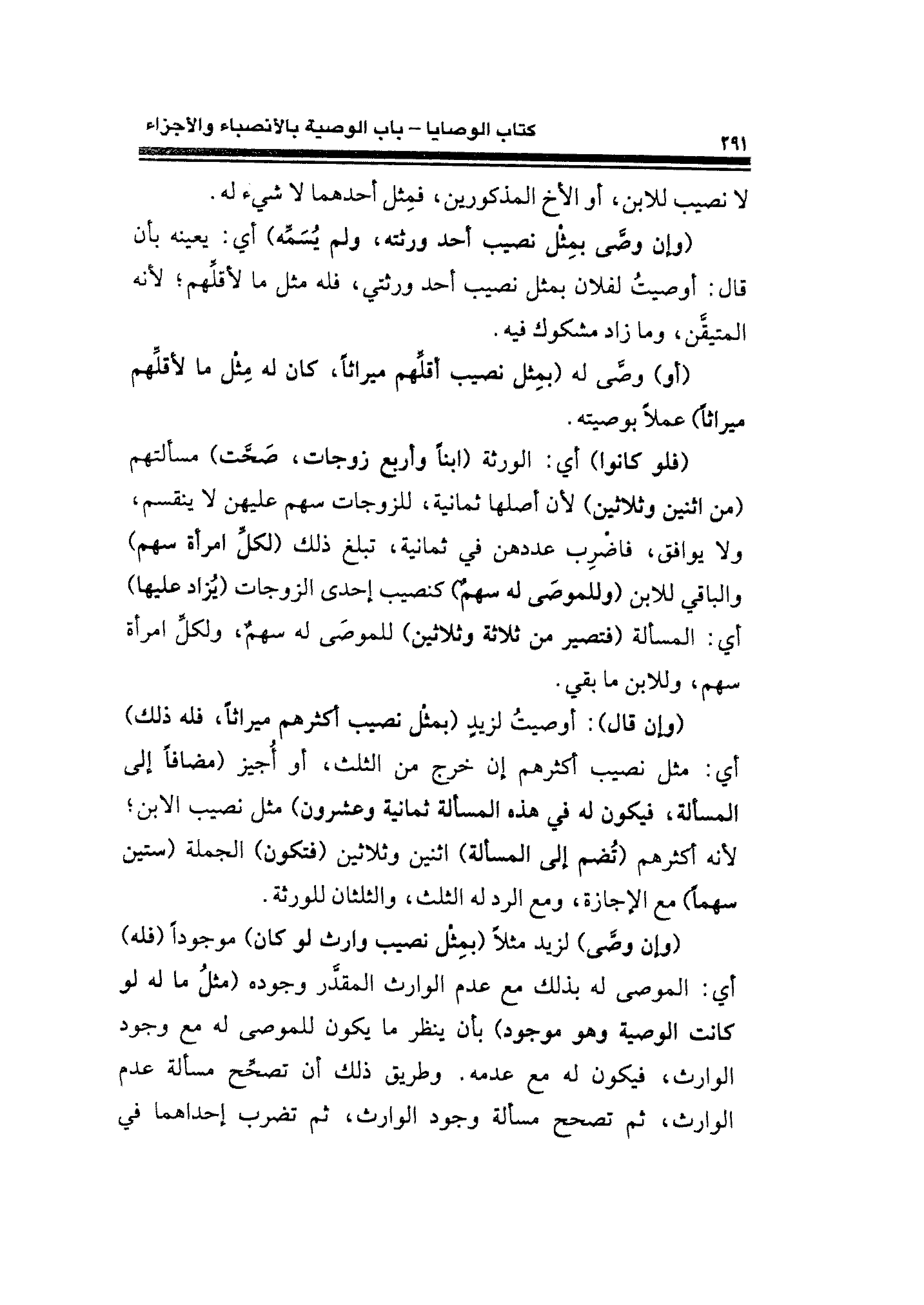 (وإن وصَّى) لزيد مثلًا (بمِثْل نصيب وارث لو كان) موجودًا (فله) أي: الموصى له بذلك مع عدم الوارث المقدَّر وجوده (مثلُ ما له لو كانت الوصية وهو موجود) بأن ينظر ما يكون للموصى له مع وجود الوارث، فيكون له مع عدمه. وطريق ذلك أن تصحِّح عائشة عدم الوارث، ثم تصحح مسألة وجود الوارث، ثم تضرب إحداهما في