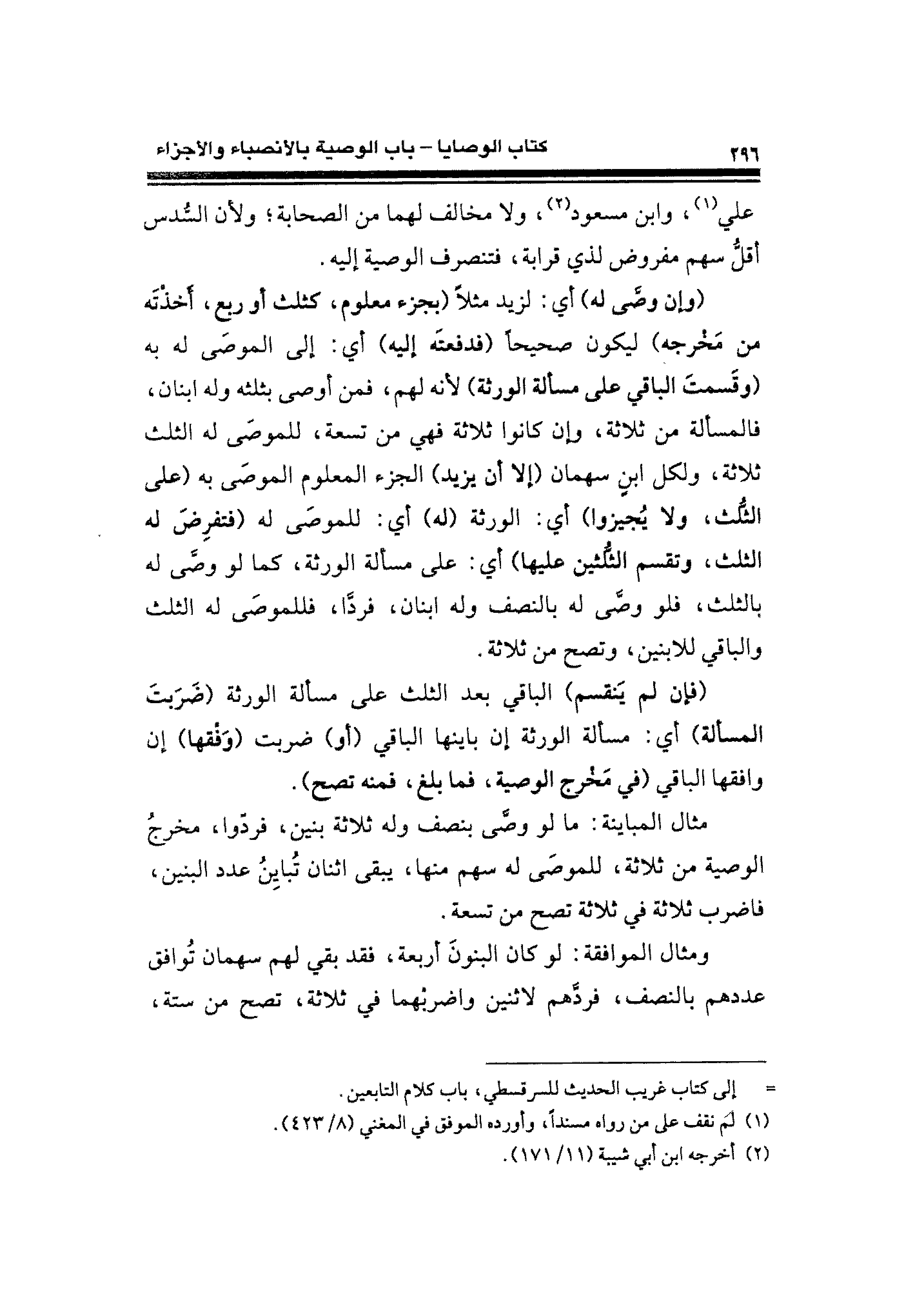 مثال المباينة: ما لو وصَّى بنصف وله ثلاثة بنين، فردّوا، مخرجُ الوصية من ثلاثة، للموصَى له سهم منها، يبقى اثنان تُبايِنُ عدد البنين، فاضرب ثلاثة في ثلاثة تصح من تسعة.