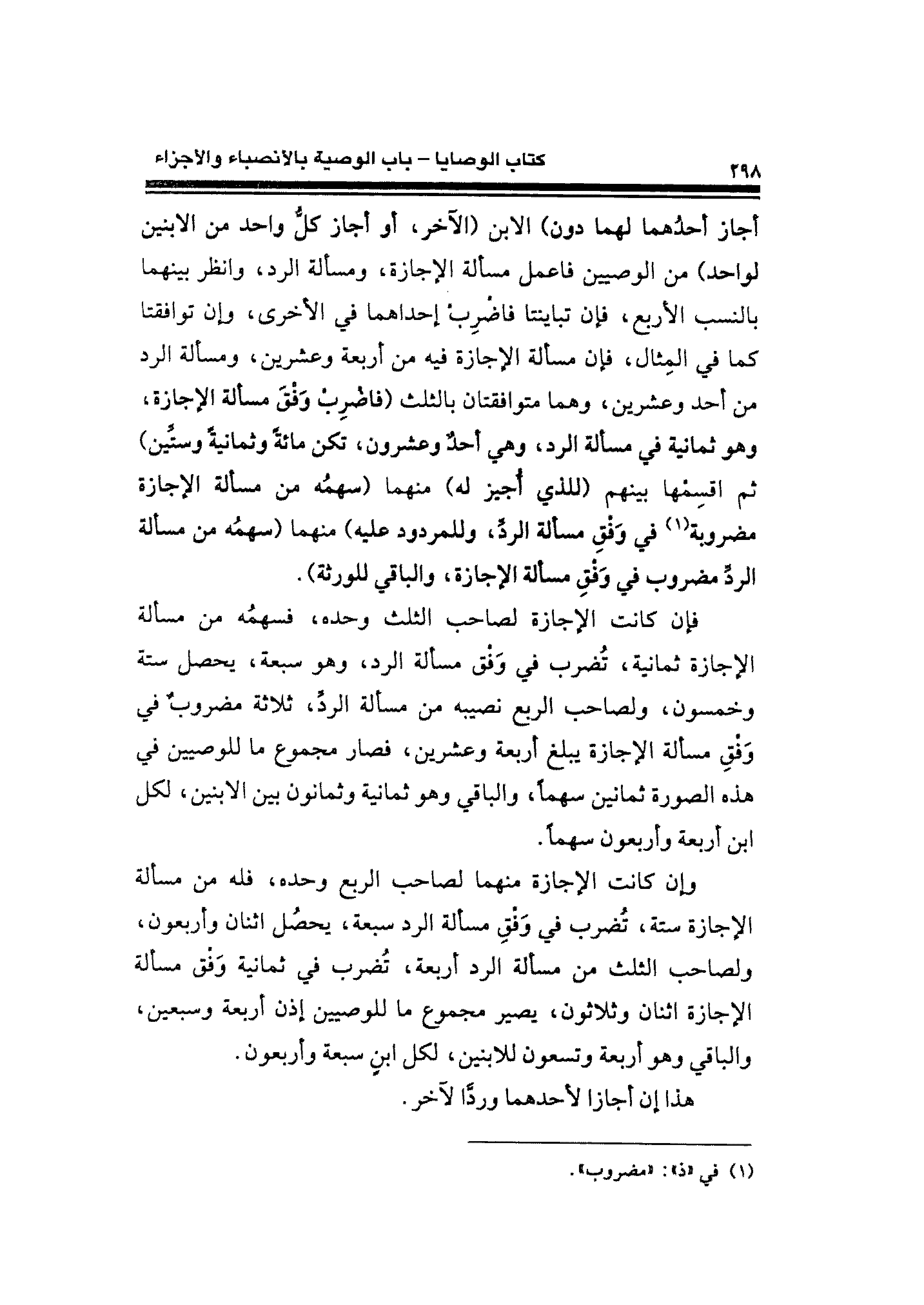 فإن كانت الإجازة لصاحب الثلث وحده، فسهمُه من مسألة الإجازة ثمانية، تُضرب في وَفْق مسألة الرد، وهو سبعة، يحصل ستة وخمسون، ولصاحب الربع نصيبه من مسألة الردُّ، ثلاثة مضروبٌ في وَفْقِ مسألة الإجازة يبلغ أربعة وعشرين، فصار مجموع ما للوصيين في هذه الصورة ثمانين سهمًا، والباقي وهو ثمانية وثمانون بين الابنين، لكل ابن أربعة وأربعون سهمًا.