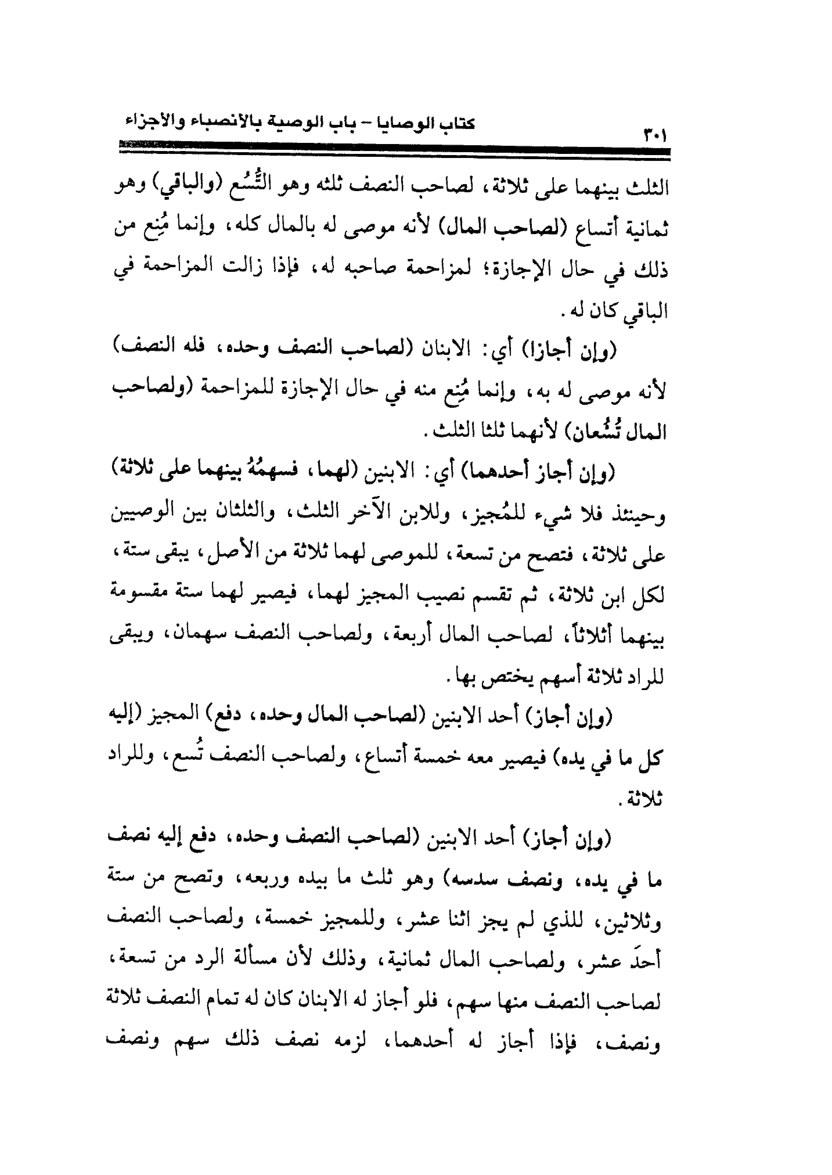 (وإن أجازا) أي: الابنان (لصاحب النصف وحده، فله النصف) لأنه موصى له به، وإنما مُنِع منه في حال الإجازة للمزاحمة (ولصاحب المال تُسُّعان) لأنهما ثلثا الثلث.