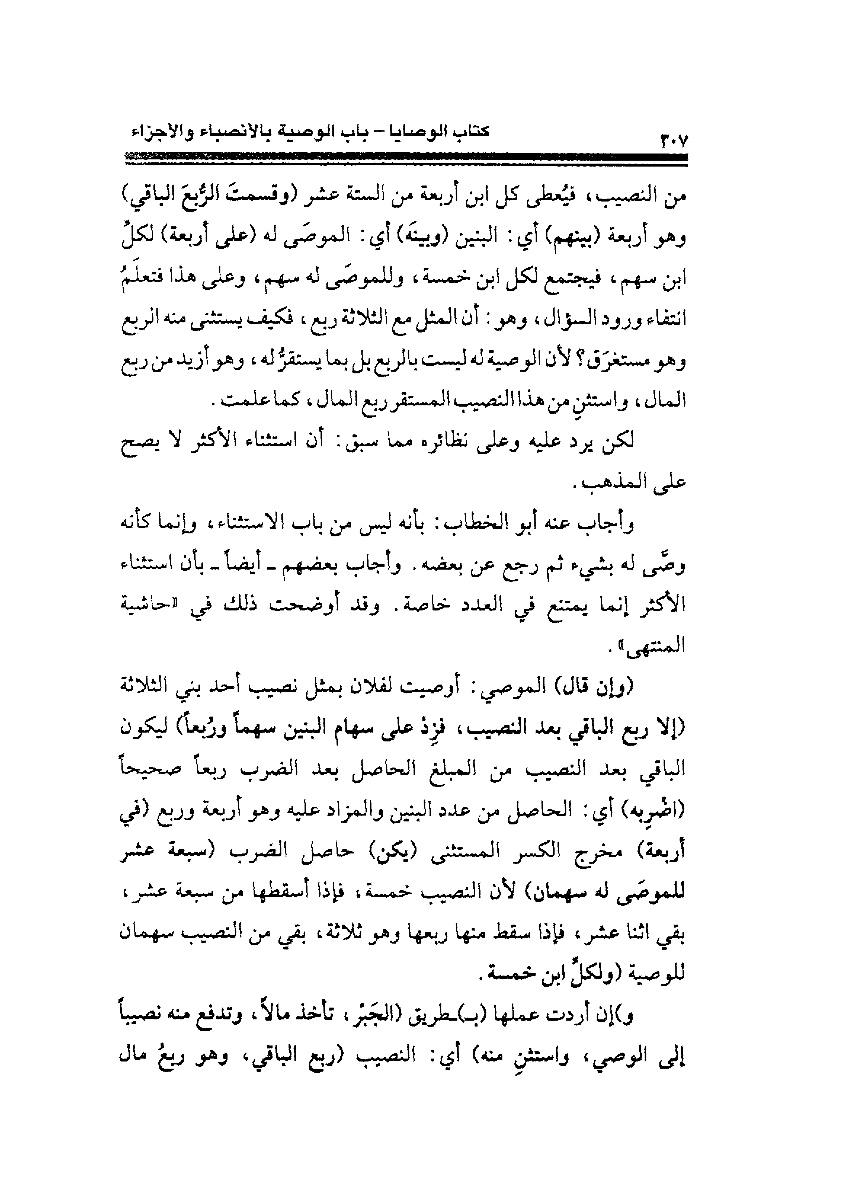 (وإن قال) الموصي: أوصيت لفلان بمثل نصيب أحد بني الثلاثة (إلا ربع الباقي بعد النصب، فزِدْ على سهام البنين سهمًا ورُبعًا) ليكون الباقي بعد النصيب من المبلغ الحاصل بعد الضرب ربعًا صحيحًا (اضْرِبه) أي: الحاصل عن عدد البنين والمزاد عليه وهو أربعة وربع (في أربعة) مخرج الكسر المستثنى (يكن) حاصل الضرب (سبعة عشر للموصَى له سهمان) لأن النصيب خمسة، فإذا أسقطها من سبعة عشر، بقي اثنا عشر، فإذا سقط عنها ربعها وهو ثلاثة، بقي من النصيب سهمان للوصية (ولكلِّ ابن خمسة.