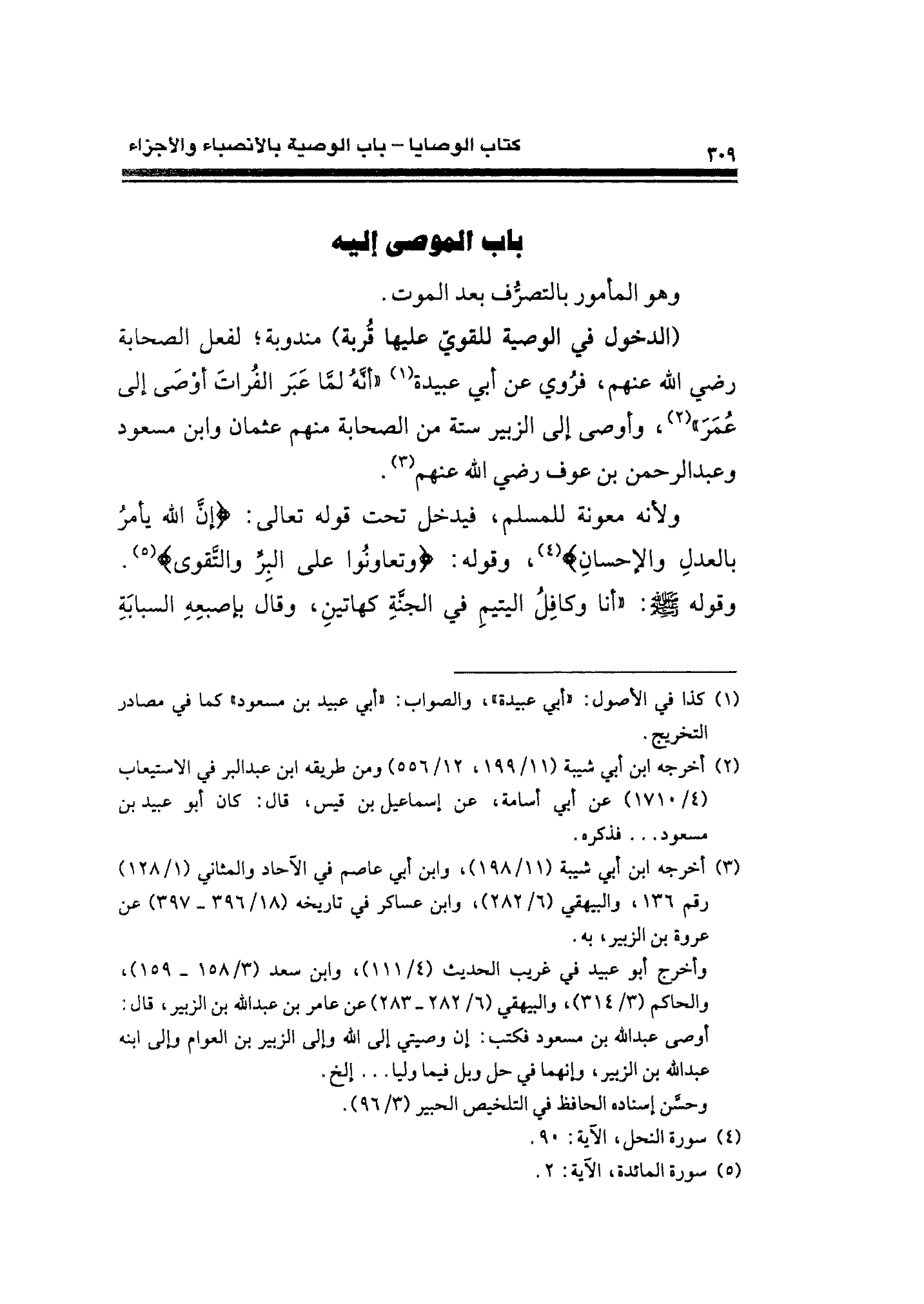 وأخرج أبو عبيد في غريب الحديث (٤/ ١١١)، وابن سعد (٣/ ١٥٨ - ١٥٩)، والحاكم (٣/ ٣١٤)، والبيهقي (٦/ ٢٨٢ - ٢٨٣) عن عامر بن عبد الله بن الزبير، قال: أوصى عبد الله بن مسعود فكتب: إن وصيتي إلى الله وإلى الزُّبير بن العوام وإلى ابنه عبد الله بن الزبير، وإنهما في حل وبل فيما وليا ... إلخ.