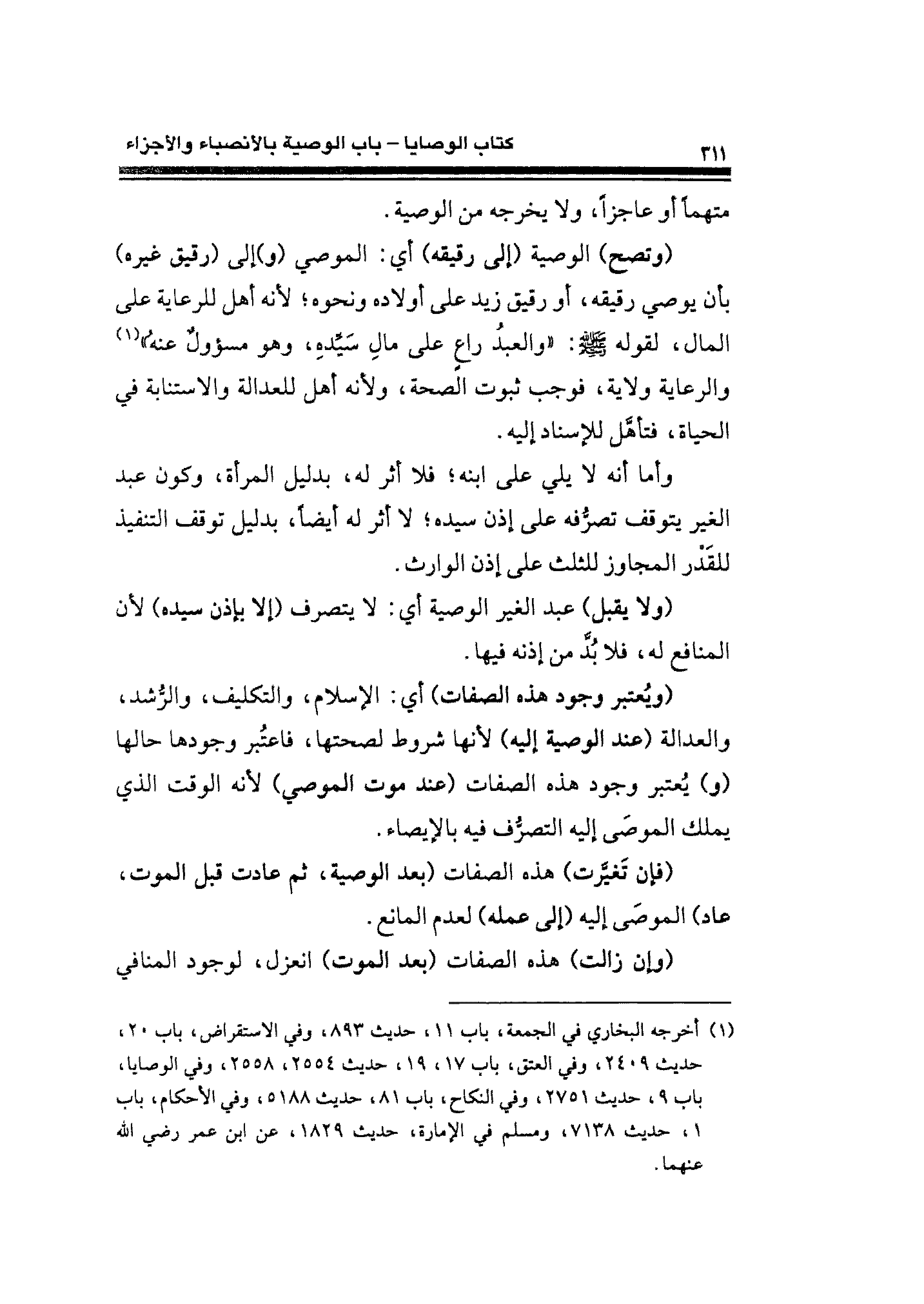 (وتصح) الوصية (إلى رقيقه) أي: الموصي (و) إلى (رقيق غيره) بأن يوصي رقيقه، أو رقيق زيد على أولاده ونحوه؛ لأنه أهل للرعاية على المال، لقوله - صلى الله عليه وسلم -: "والعبدُ راعٍ على مالِ سَيِّدهِ، وهو مسؤولٌ عنهُ" (¬١) والرعاية ولاية، فوجب ثبوت الصحة، ولأنه أهل للعدالة والاستنابة في الجاة، فتأهَّل للإسناد إليه.