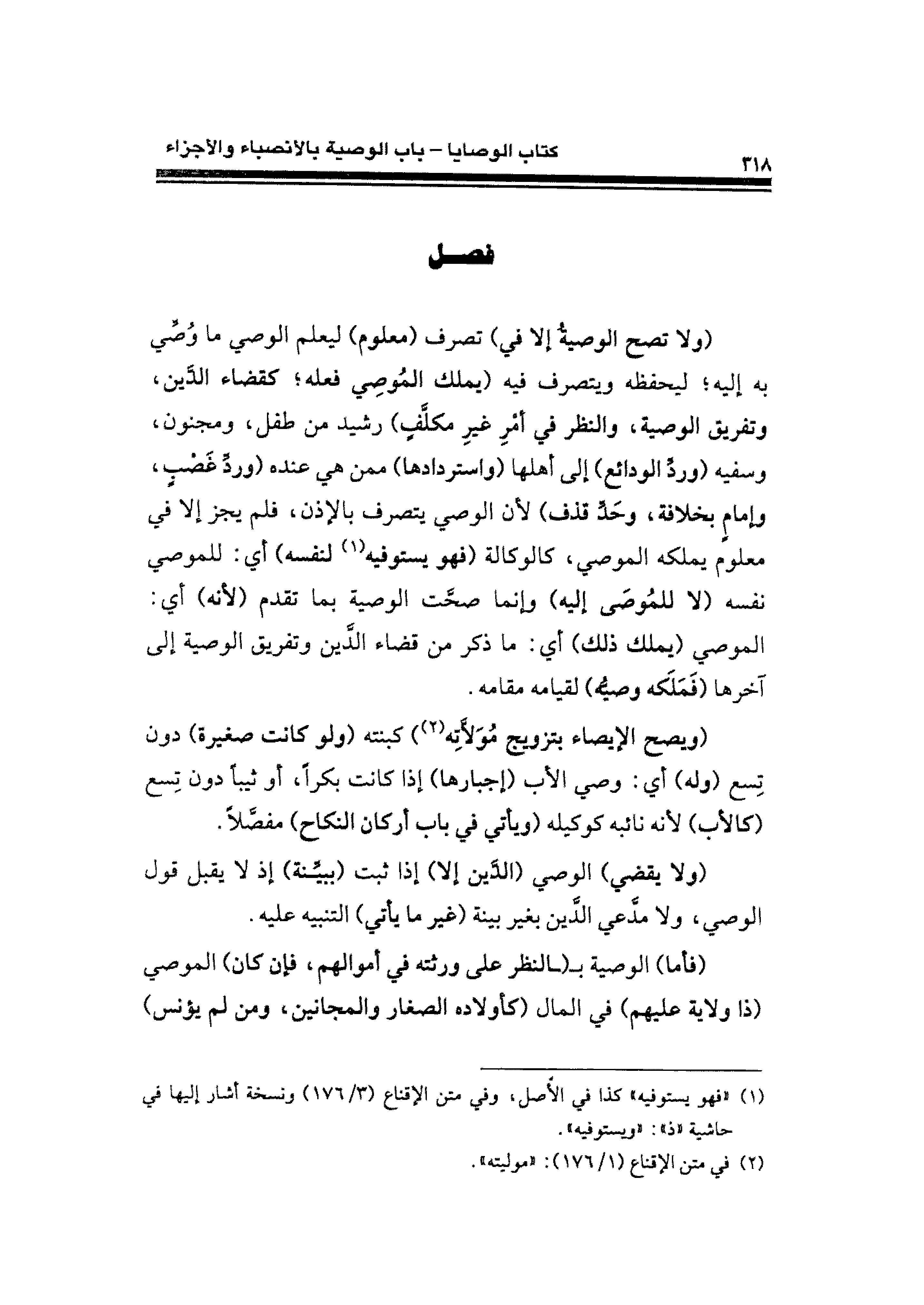 (ولا تصح الوصيةُ إلا في) تصرف (معلوم) يعلم الوصي ما وُصِّي به إليه؛ ليحفظه ويتصرف فيه (يملك المُوصِي فعله؛ كقضاء الدَّين، وتفريق الوصية، والنظر في أمْرٍ غيرِ مكلَّفٍ) رشيد عن طفل، ومجنون، وسفيه (وردِّ الودائع) إلى أهلها (واستردادها) ممن هي عنده (وردِّ غَضْبٍ، وإمامٍ بخلافة، وحَدِّ قذف) لأن الوصي يتصرف بالإذن، فلم يجز إلا في معلوم بملكه الموصي، كالوكالة (فهو يستوفيه (¬١) لنفسه) أي: للموصي نفسه (لا للمُوصًى إليه) وإنما صحَّت الوصية بما تقدم (لأنه) أي: الموصي (يملك ذلك) أي: ما ذكر من قضاء الدَّين وتفريق الوصية إلى آخرها (فَمَلَكه وصيُّه) لقيامه مقامه.