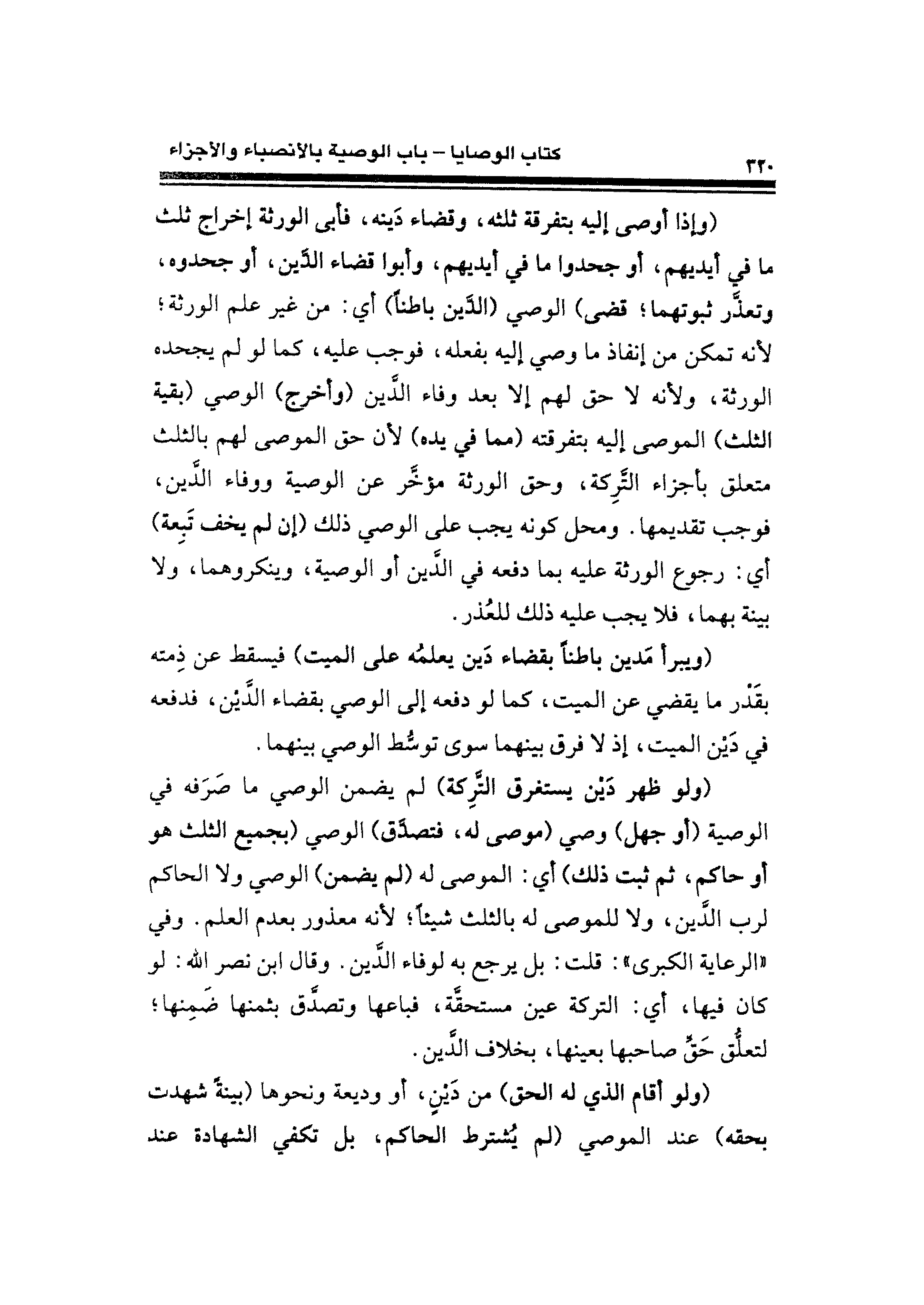 (وإذا أوصى إليه بتفرقة ثلثه، وقضاء دَينه، فأبى الورثة إخراج ثلث ما في أيديهم، أو جحدوا ما في أيديهم، وأبوا قضاء الدَّين، أو جحدوه، وتعذَّر ثبوتهما؛ قضى) الوصي (الدَّين باطنًا) أي: من غير علم الورثة؛ لأنه تمكن من إنفاذ ما وصي إليه بفعله، فوجب عليه، كما لو لم يجحده الورثة، ولأنه لا حق لهم إلا بعد وفاء الدَّين (وأخرج) الوصي (بقية الثلث) الموصى إليه بتفرقته (مما في يده) لأن حق الموصى لهم بالثلث متعلق بأجزاء التَّرِكة، وحق الورثة مؤخَّر عن الوصية ووفاء الدَّين، فوجب تقديمها. ومحل كونه يجب على الوصي ذلك (إن لم يخف تَبِعة) أي: رجوع الورثة عليه بما دفعه في الدَّين أو الوصية، وينكروهما، ولا بينة بهما، فلا يجب عليه ذلك للعُذر.