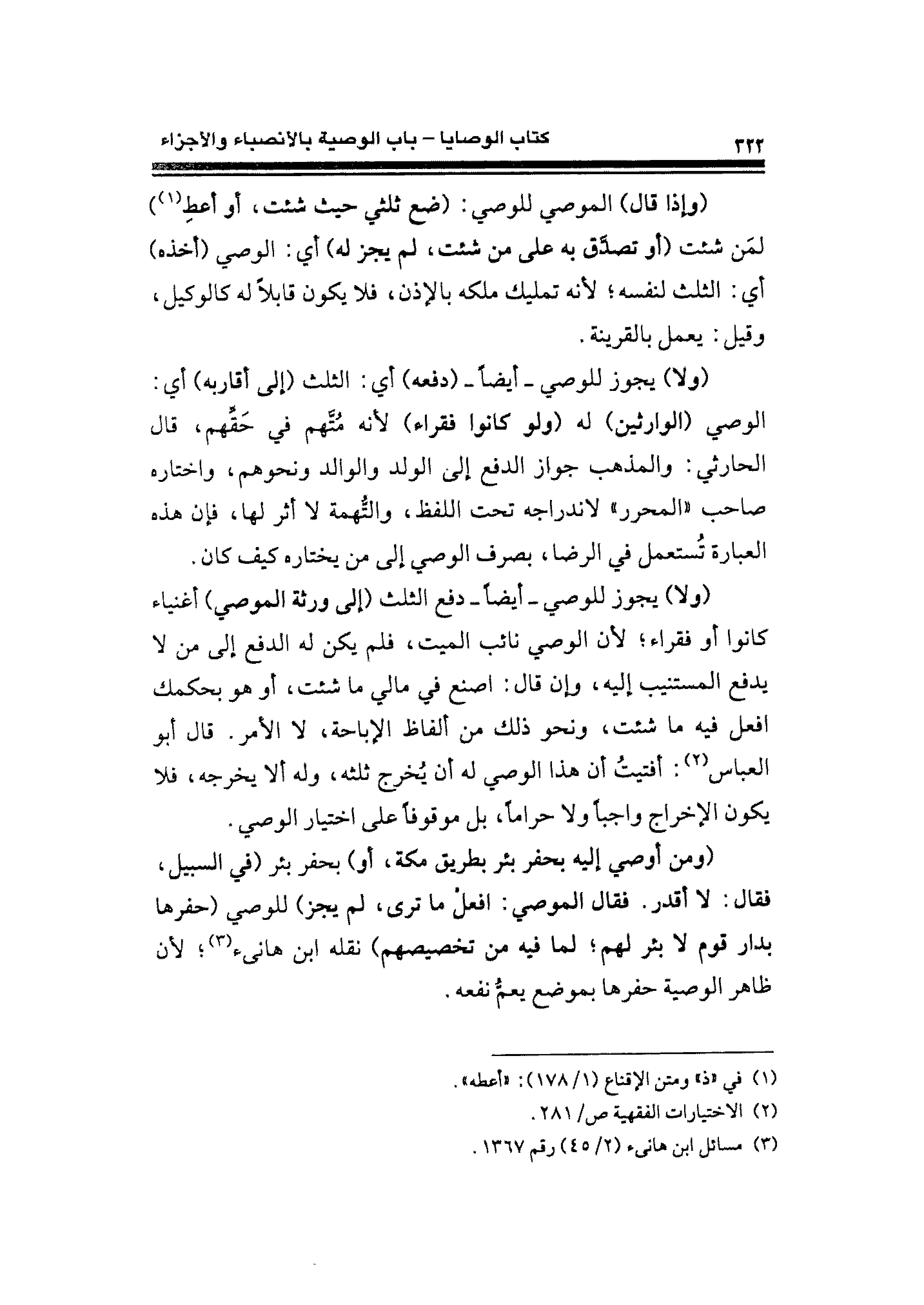 (ومن أوصي إليه بحفر بئر بطريق مكة، أو) بحفر بئر (في السبيل، فقال: لا أقدر. فقال الموصي: افعلْ ما ترى، لم يجز) للوصي (حفرها بدار قوم لا بئر لهم؛ لما فيه من تخصيصهم) نقله ابن هانئ (¬٣)؛ لأن ظاهر الوصية حفرها بموضع يعمُّ نفعه.