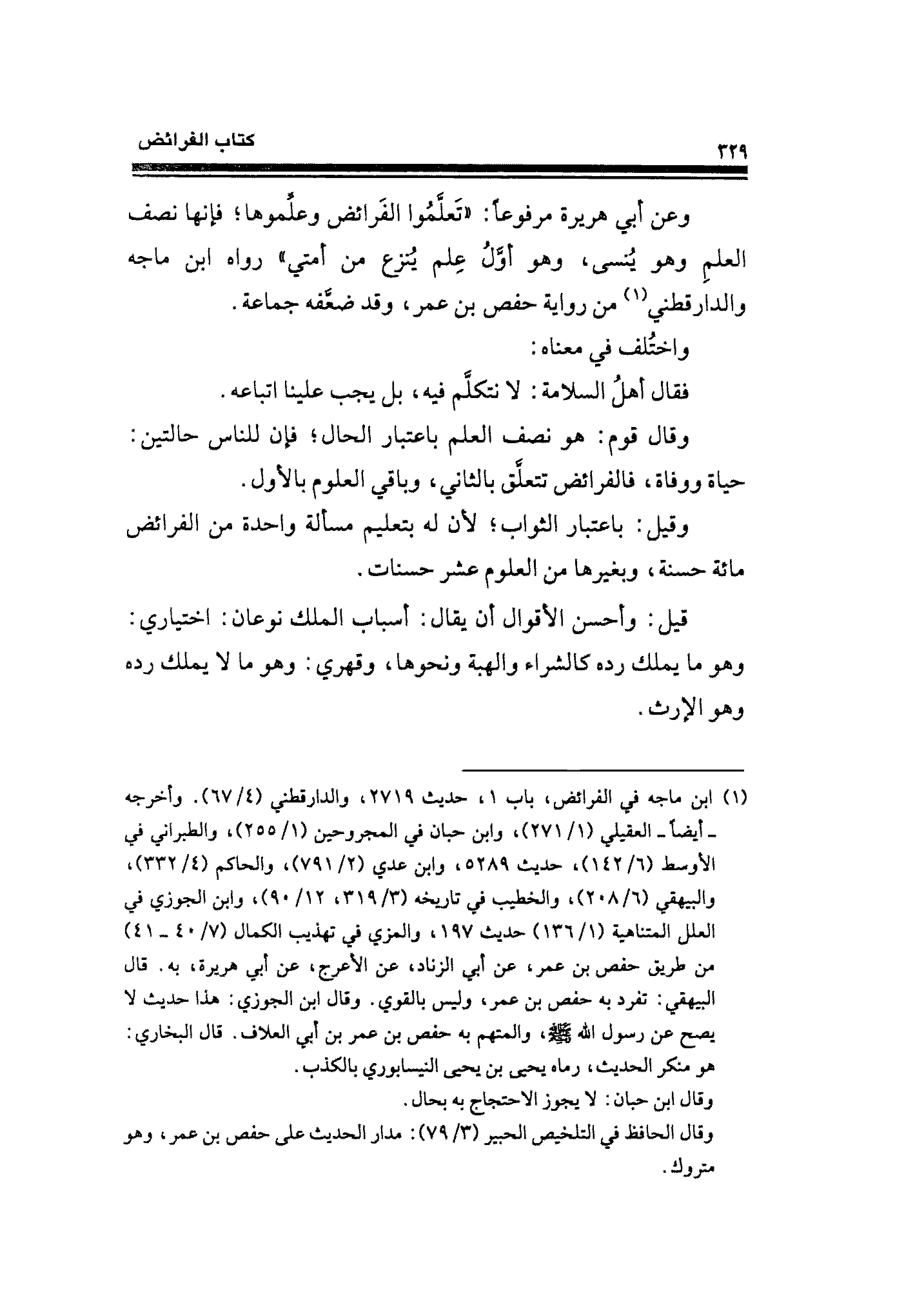 وعن أبي هريرة مرفوعًا: "تَعلمُوا الفَرائض وعلموها؛ فإنها نصف العلمِ وهو يُنسى، وهو أولُ عِلم يُنزع من أمتي" رواه ابن ماجه والدارقطني (¬١) من رواية حفص بن عمر، وقد ضعفه جماعة.