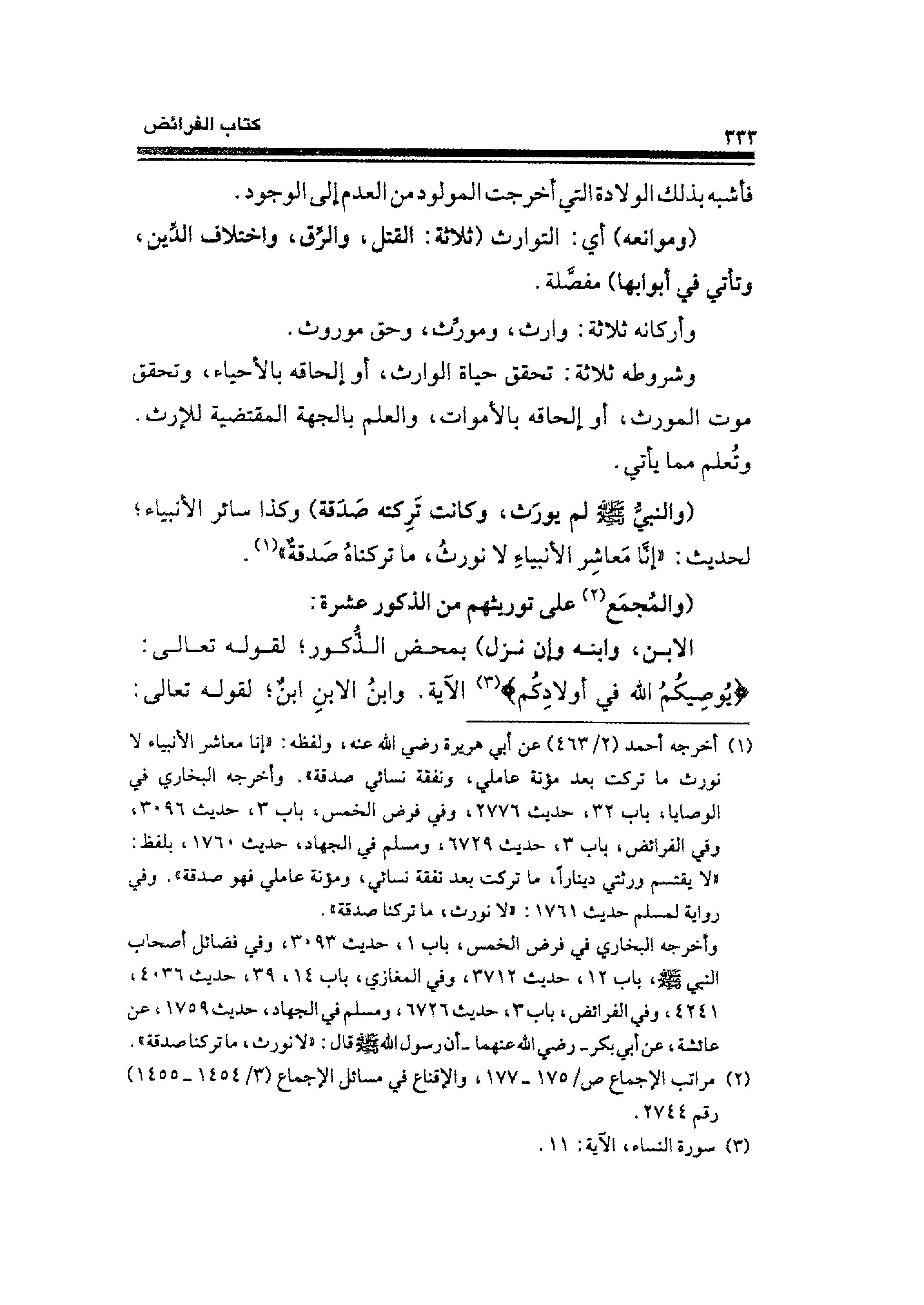 (وموانعه) أي: التوارث (ثلاثة: القتل، والرق، واختلاف الدين، وتأتي في أبوابها) مفصلة.
