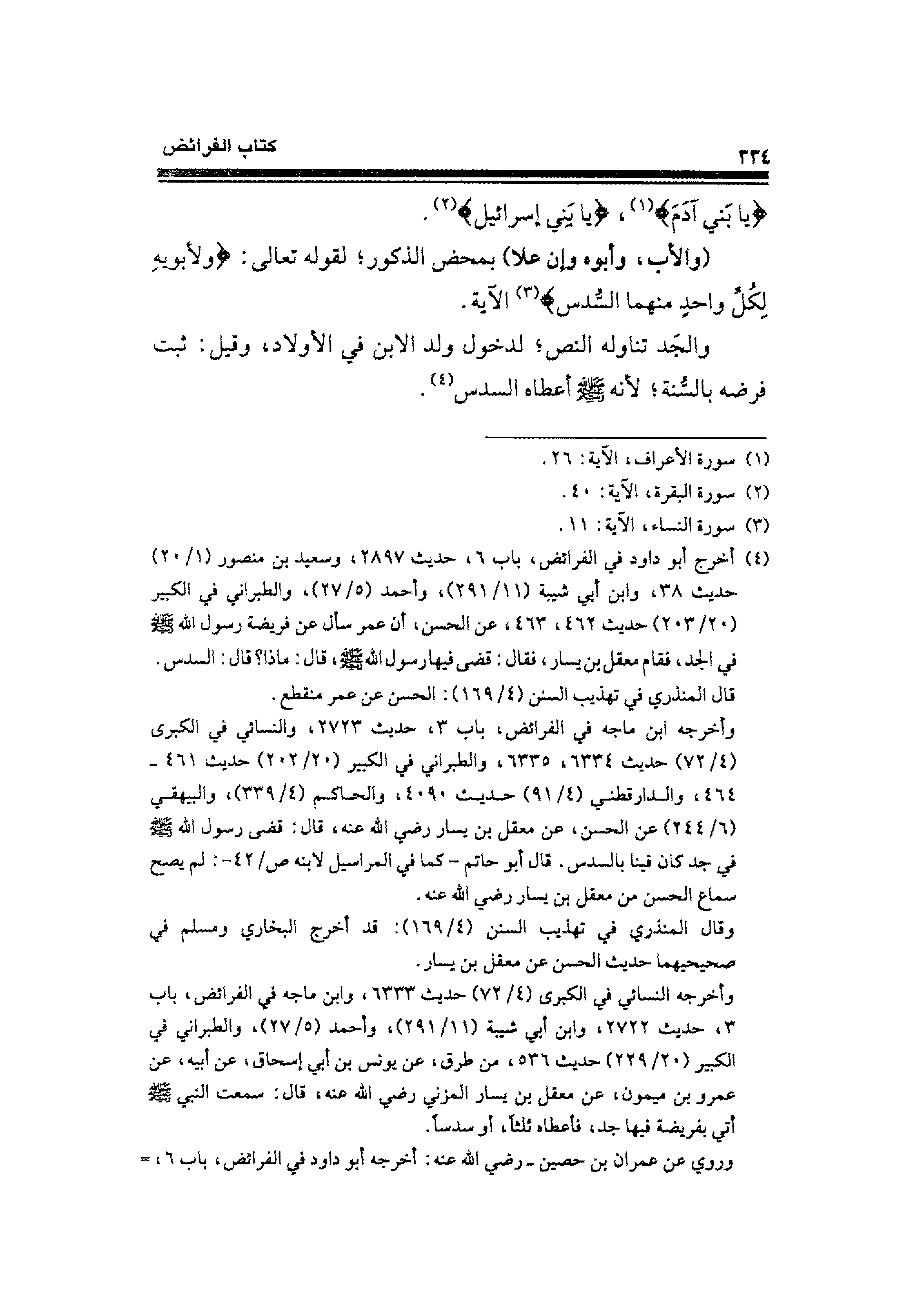 (¬٤) أخرج أبو داود في الفرائض، باب ٦، حديث ٢٨٩٧، وسعيد بن منصور (١/ ٢٠) حديث ٣٨، وابن أبي شيبة (١١/ ٢٩١)، وأحمد (٥/ ٢٧)، والطبراني في الكبير (٢٠/ ٣٠٣) حديث ٤٦٢، ٤٦٣، عن الحسن، أن عمر سأل عن فريضة رسول الله - صلى الله عليه وسلم - في الجد، فقام معقل بن يسار، فقال: قضى فيها رسول الله - صلى الله عليه وسلم -، قال: ماذا؟ قال: السدس.