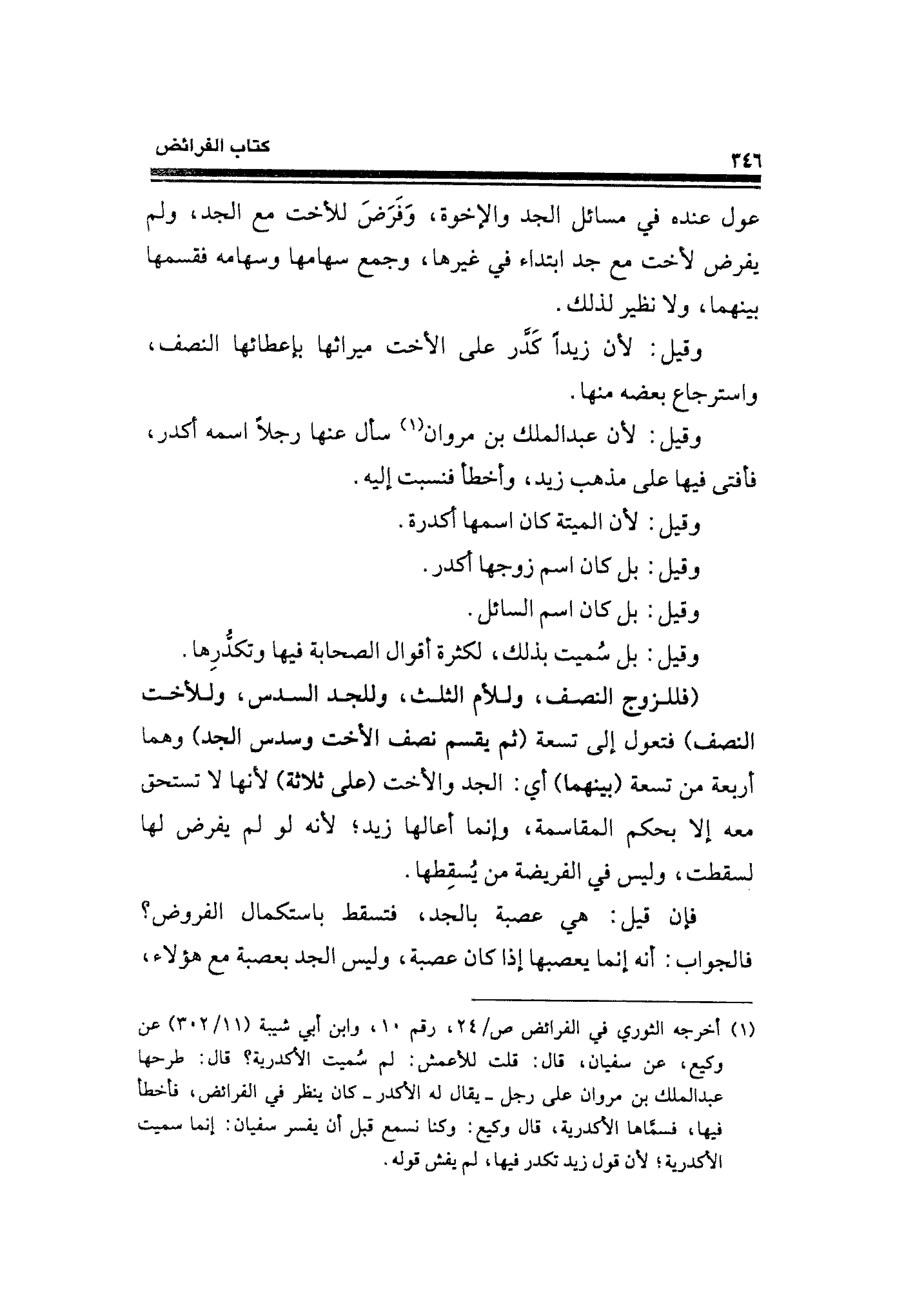 (¬١) أخرجه الثَّوريّ فِي الفرائض ص / ٢٤، رقم ١٠، وابن أبي شيبة (١١/ ٣٠٢) عن وكيع، عن سفيان، قال: قلت للأعمش: لم سُميت الأكدرية؟ قال: طرحها عبد الملك بن مروان على رجل -يقال له الأكدر- كان ينظر فِي الفرائض، فأخطأ فيها، فسمَّاها الأكدرية، قال وكيع: وكنا نسمع قبل أن يفسر سفيان: إنما سميت الأكدرية؛ لأن قول زيد تكدر فيها، لم يفش قوله.