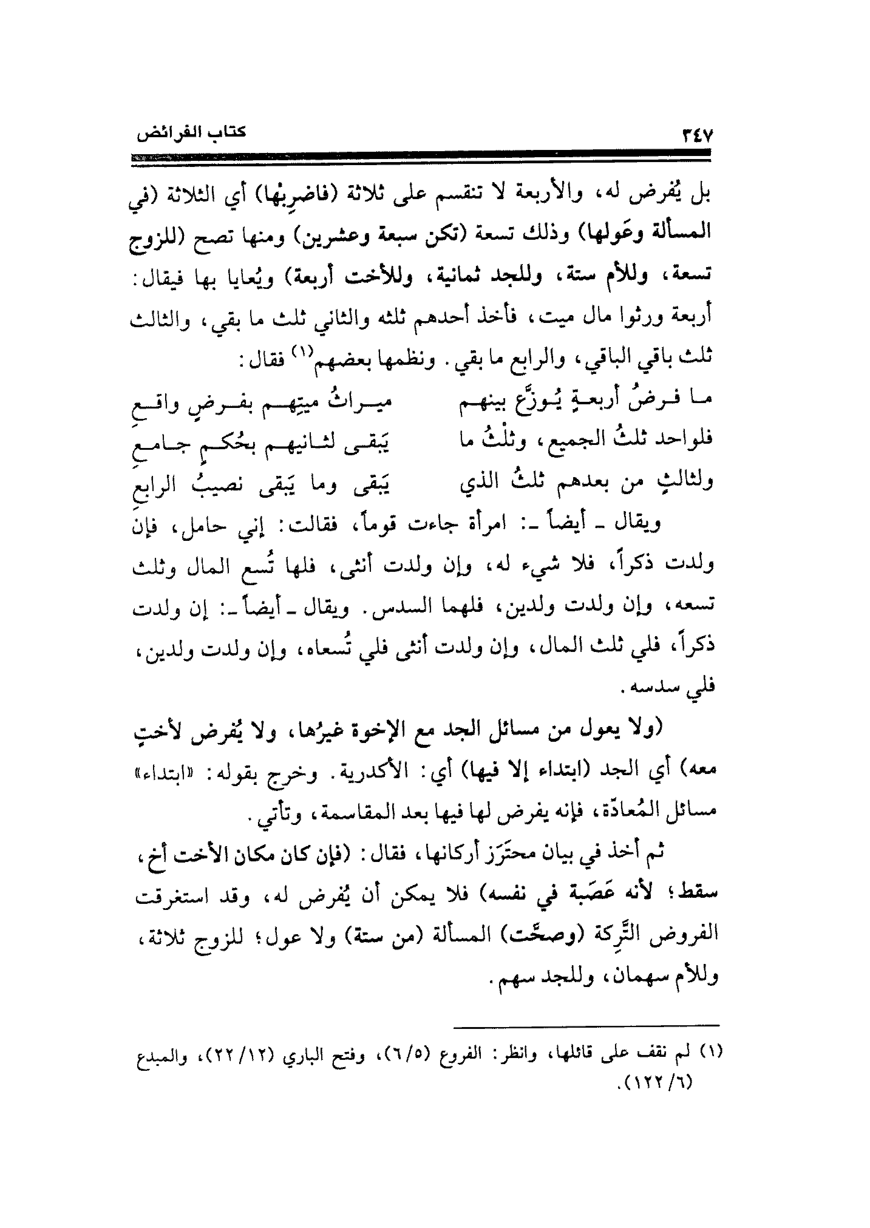 بل يُفرض له، والأربعة لا تنقسم على ثلاثة (فاضرِبْها) أي الثلاثة (في المسألة وعَولها) وذلك تسعة (تكن سبعة وعشرين) ومنها تصح (للزوج تسعة، وللأم ستة، وللجد ثمانية، وللأخت أربعة) ويُعايا بها فيقال: أربعة ورثوا مال ميت، فأخذ أحدهم ثلثه والثاني ثلث ما بقي، والثالث ثلث باقي الباقي، والرابع ما بقي. ونظمها بعضهم (¬١) فقال: