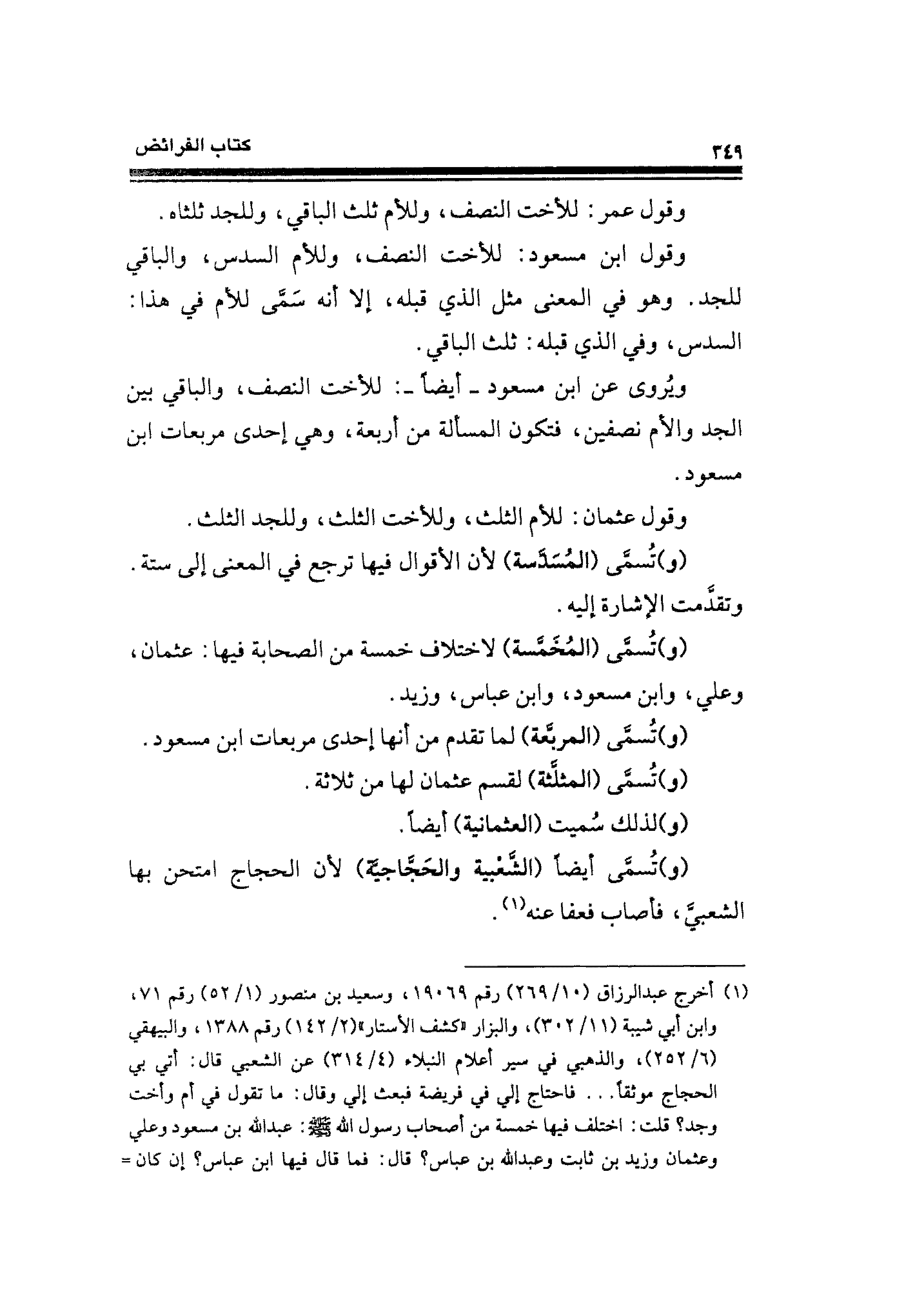 (¬١) أخرج عبد الرازق (١٠/ ٢٦٩) رقم ١٩٠٦٩ وسعيد بن منصور (١/ ٥٢) رقم ٧١، وابن أبي شيبة (١١/ ٣٠٢)، والبزار "كشف الأستار" (٢/ ١٤٢) رقم ١٣٨٨ والبيهقي (٦/ ٢٥٢)، والذهبي في سير أعلام النبلاء (٤/ ٣١٤) عن الشعبي قال: أتى بي الحجاج موثقًا ... فاحتاج إلي في فريضة فبعث إلي وقال: ما تقول في أم وأخت وجد؟ قلت: اختلف فيها خمسة من أصحاب رسول الله - صلى الله عليه وسلم -: عبد الله بن مسعود وعلي وعثمان وزيد بن ثابت وعبد الله بن عباس؟ قال: فما قال فيها ابن عباس؟ إن كان =