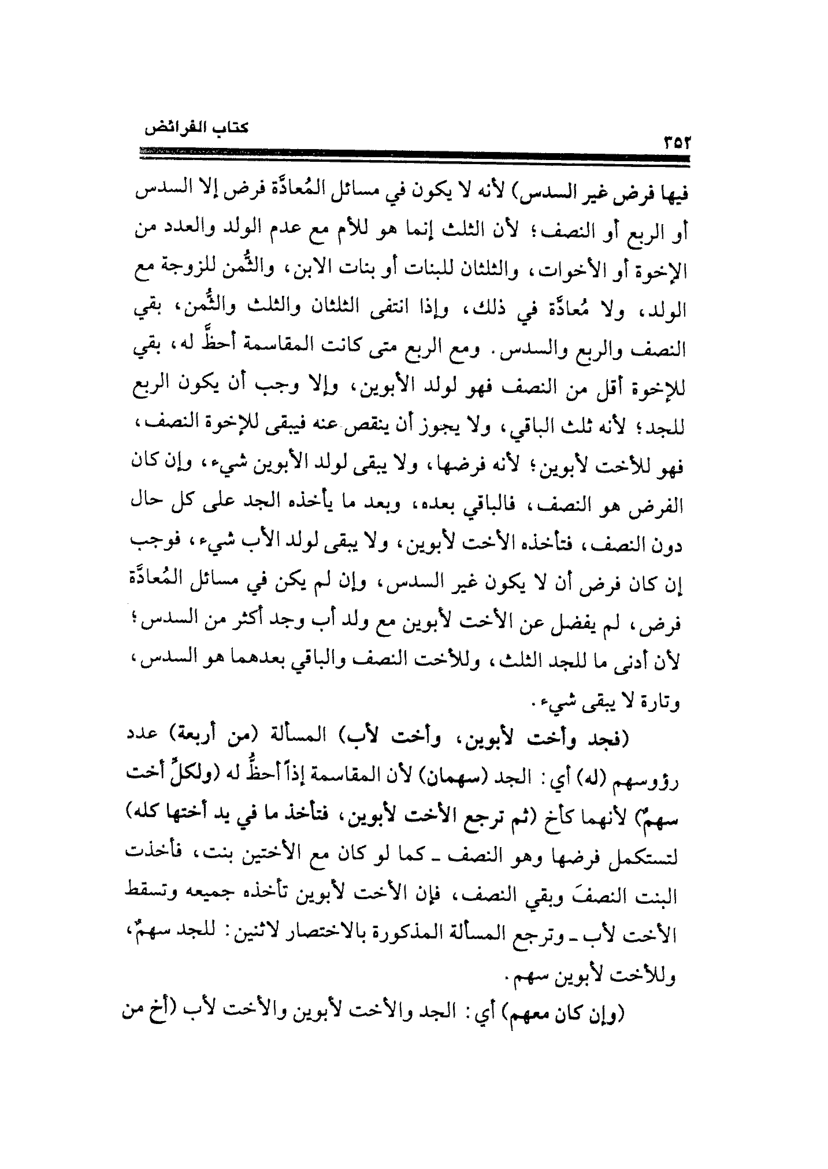 فيها فرض غير السدس) لأنه لا يكون في مسائل المُعادَّة فرض إلا السدس أو الربع أو النصف؛ لأن الثلث إنما هو للأم مع عدم الولد والعدد من الإخوة أو الأخوات، والثلثان للبنات أو بنات الابن، والثُّمن للزوجة مع الولد، ولا مُعادَّة في ذلك، وإذا انتفى الثلثان والثلث والثُّمن، بقي النصف والربع والسدس. ومع الربع متى كانت المقاسمة أحظَّ له، بقي للأخوة أقل من النصف فهو لولد الأبوين، وإلا وجب أن يكون الربع للجد؛ لأنه ثلث الباقي، ولا يجوز أن ينقص عنه فيبقى للإخوة النصف، فهو للأخت لأبوين؛ لأنه فرضها، ولا يبقى لولد الأبوين شيء، وإن كان الفرض هو النصف، فالباقي بعده، وبعد ما يأخذه الجد على كل حال دون النصف، فتأخذه الأخت لأبوين، ولا يبقى لولد الأب شيء، فوجب إن كان فرض أن لا يكون غير السدس، وإن لم يكن في مسائل المُعادَّة فرض، لم يفضل عن الأخت لأبوين مع ولد أب وجد أكثر من السدس؛ لأن أدنى ما للجد الثلث، وللأخت النصف والباقي بعدهما هو السدس، وتارة لا يبقى شيء.