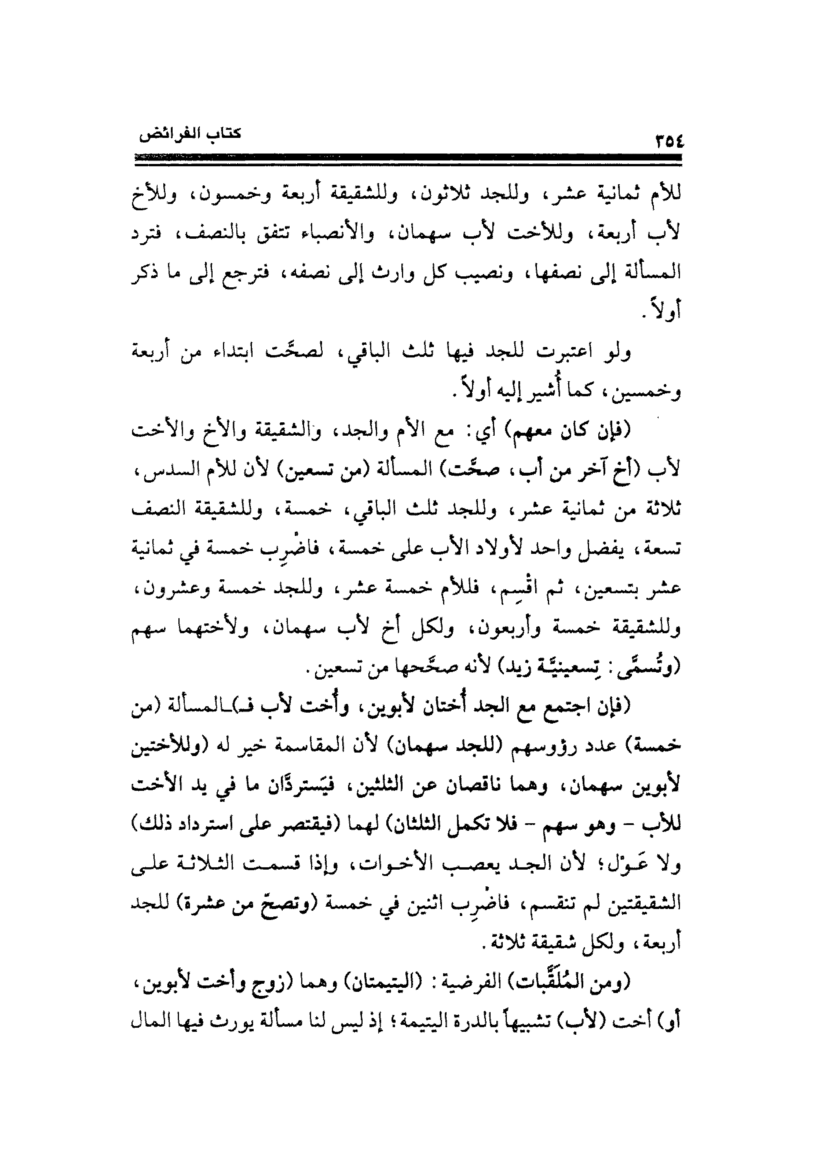 للأم ثمانية عشر، وللجد ثلاثون، وللشقيقة أربعة وخمسون، وللأخ لأب أربعة، وللأخت لأب سهمان، والأنصباء تتفق بالنصف، فترد المسألة إلى نصفها، ونصيب كل وارث إلى نصفه، فترجع إلى ما ذكر أولًا.