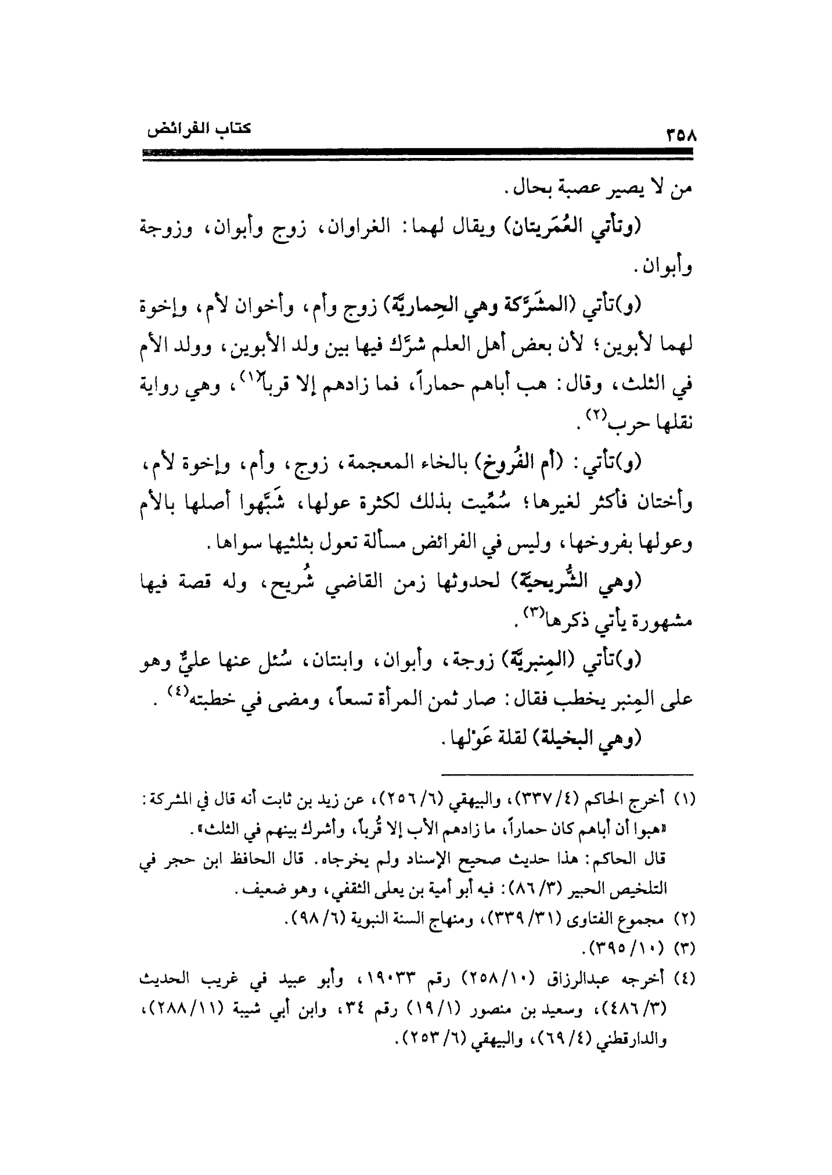 (و) تأتي (المشَرَّكة وهي الحِماريَّة) زوج وأم، وأخوان لأم، وإخوة لهما لأبوين؛ لأن بعض أهل العلم شرَّك فيها بين ولد الأبوين، وولد الأم في الثلث، وقال: هب أباهم حمارًا، فما زادهم إلا قربًا (¬١)، وهي رواية نقلها حرب (¬٢).