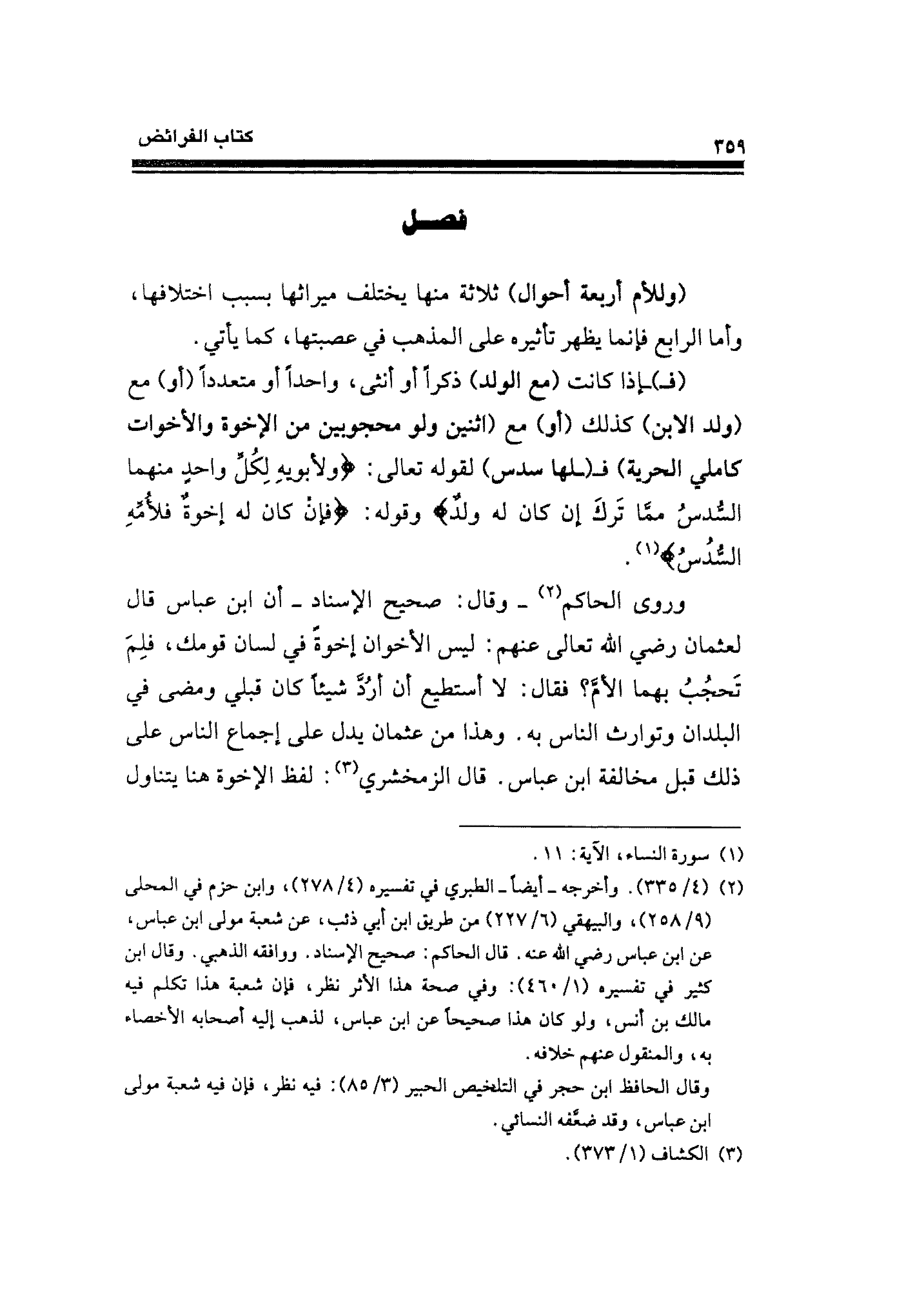 وروى الحاكم (¬٢) -وقال: صحيح الإسناد- أن ابن عباس قال لعثمان رضي الله تعالى عنهم: ليس الأخوان إخوةً في لسان قومك، فلِمَ تَحجُبُ بهما الأمَّ؟ فقال: لا أستطيع أن أرُدَّ شيئًا كان قبلي ومضى في البلدان وتوارث الناس به. وهذا عن عثمان يدل على إجماع الناس على ذلك قبل مخالفة ابن عباس. قال الزمخشري (¬٣): لفظ الإخوة هنا يتناول