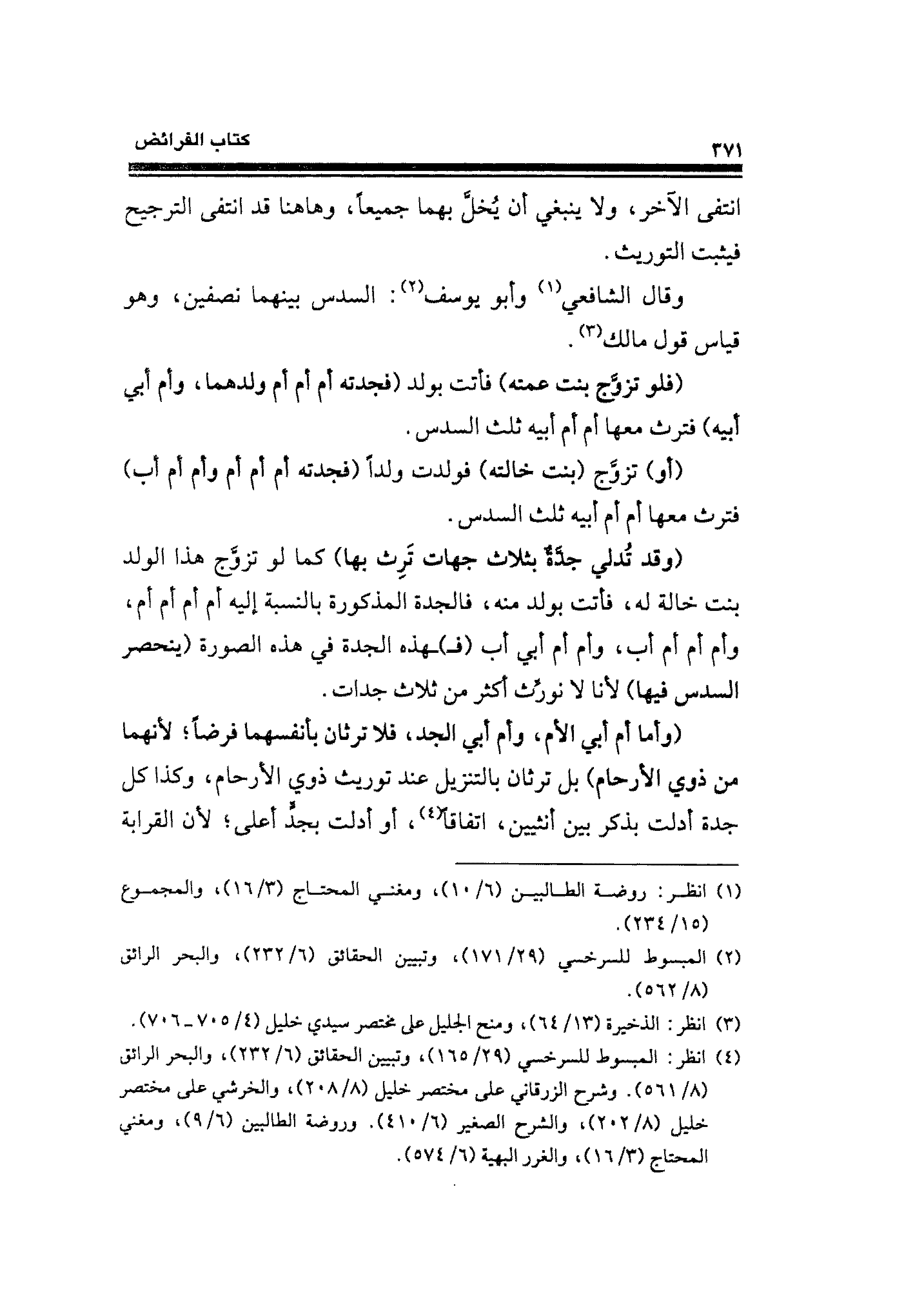 (وقد تُدلي جدَّةٌ بثلاث جهات تَرِث بها) كما لو تزوَّج هذا الولد بنت خالة له، فأتت بولد منه، فالجدة المذكورة بالنسبة إليه أم أم أم أم، وأم أم أم أب، وأم أم أبي أب (فـ) ـهذه الجدة في هذه الصورة (ينحصر السدس فيها) لأنا لا نورِّث أكثر من ثلاث جدات.