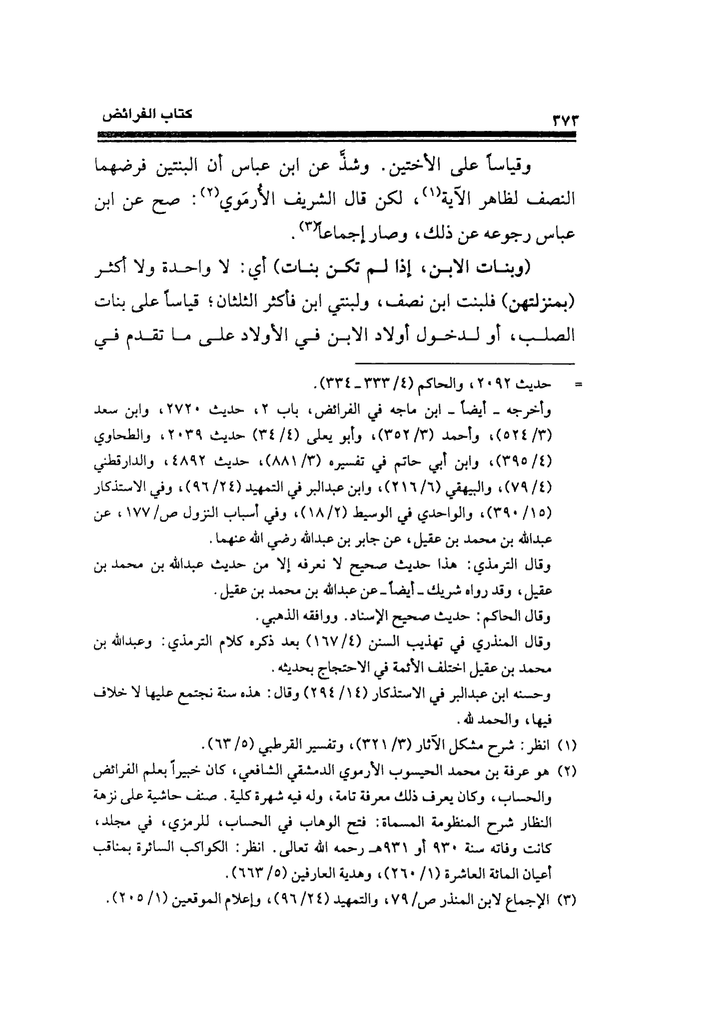 وقياسًا على الأختين. وشذَّ عن ابن عباس أن البنتين فرضهما النصف لظاهر الآية (¬١)، لكن قال الشريف الأرمَوي (¬٢): صح عن ابن عباس رجوعه عن ذلك، وصار إجماعًا (¬٣).