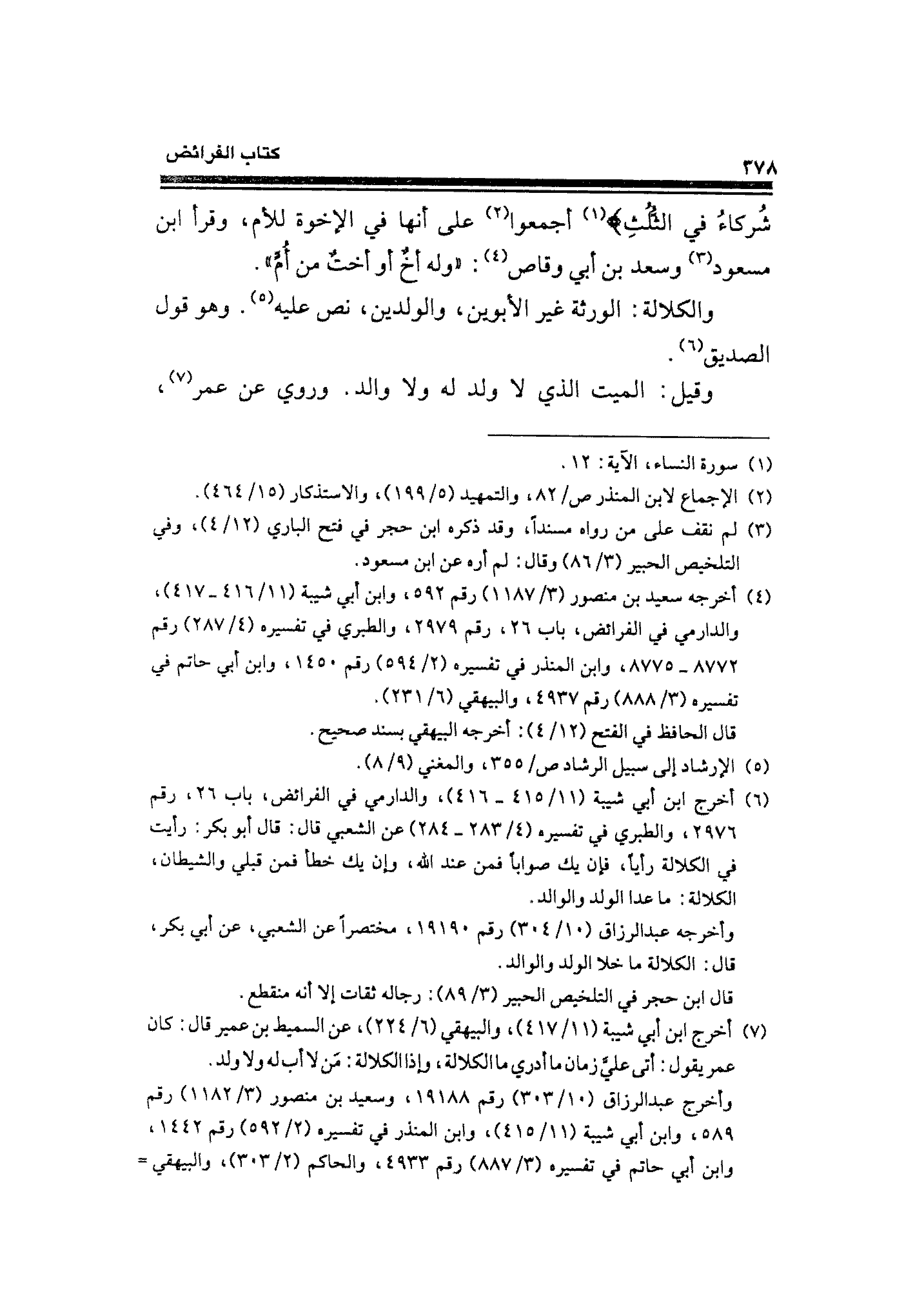 (¬٤) أخرجه سعيد بن منصور (٣/ ١١٨٧) رقم ٥٩٢، وابن أبي شيبة (١١/ ٤١٦ - ٤١٧)، والدارمي في الفرائض، باب ٢٦، رقم ٢٩٧٩، والطبري في تفسيره (٤/ ٢٨٧) رقم ٨٧٧٣ - ٨٧٧٥، وابن المنذر في تفسيره (٢/ ٥٩٤) رقم ١٤٥٠، وابن أبي حاتم في تفسيره (٣/ ٨٨٨) رقم ٤٩٣٧، والبيهقي (٦/ ٢٣١).