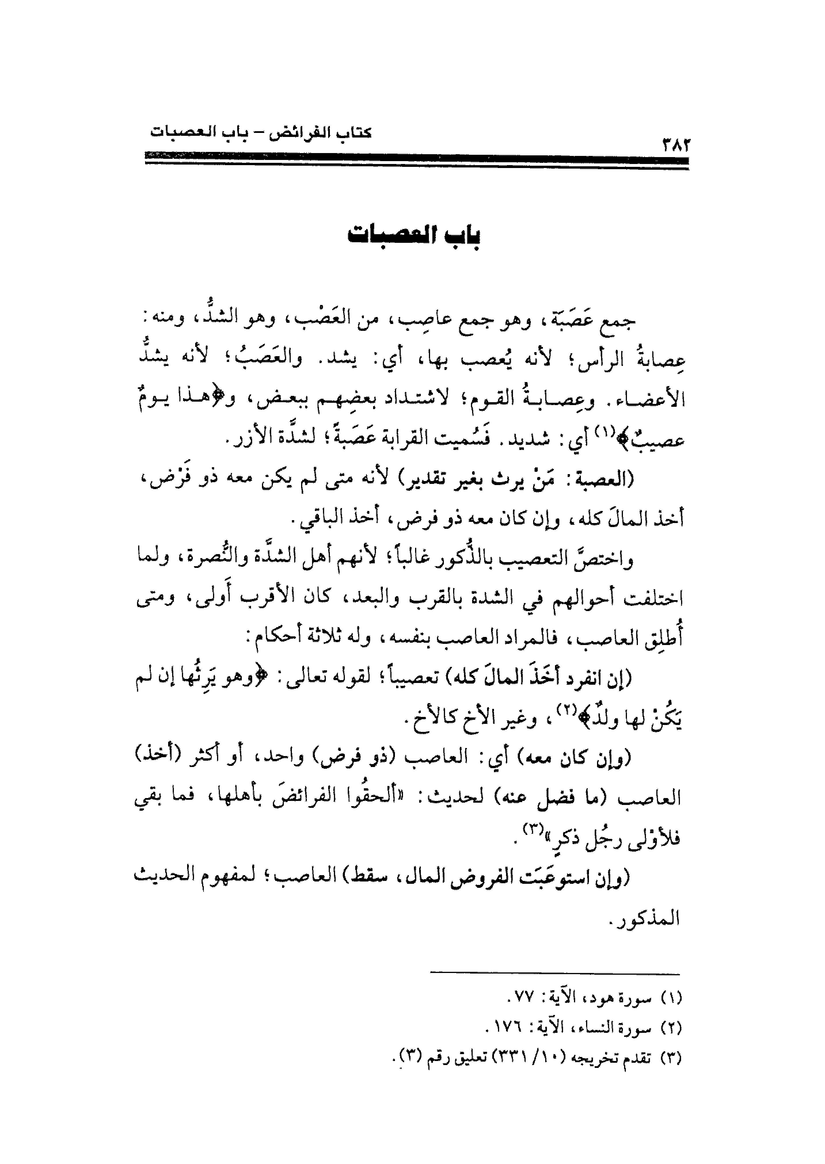جمع عَصَبَة، وهو جمع عاصِب، من العَصْب، وهو الشدُّ، ومنه: عِصابةُ الرأس؛ لأنه يُعصب بها، أي: يشد. والعَصَب؛ لأنه يشدُّ الأعضاء. وعِصابةُ القوم؛ لاشتداد بعضهم ببعض، و {هذا يومٌ عصيبٌ} (¬١) أي: شديد. فَسُميت القرابة عَصَبةَ؛ لشدة الأزر.