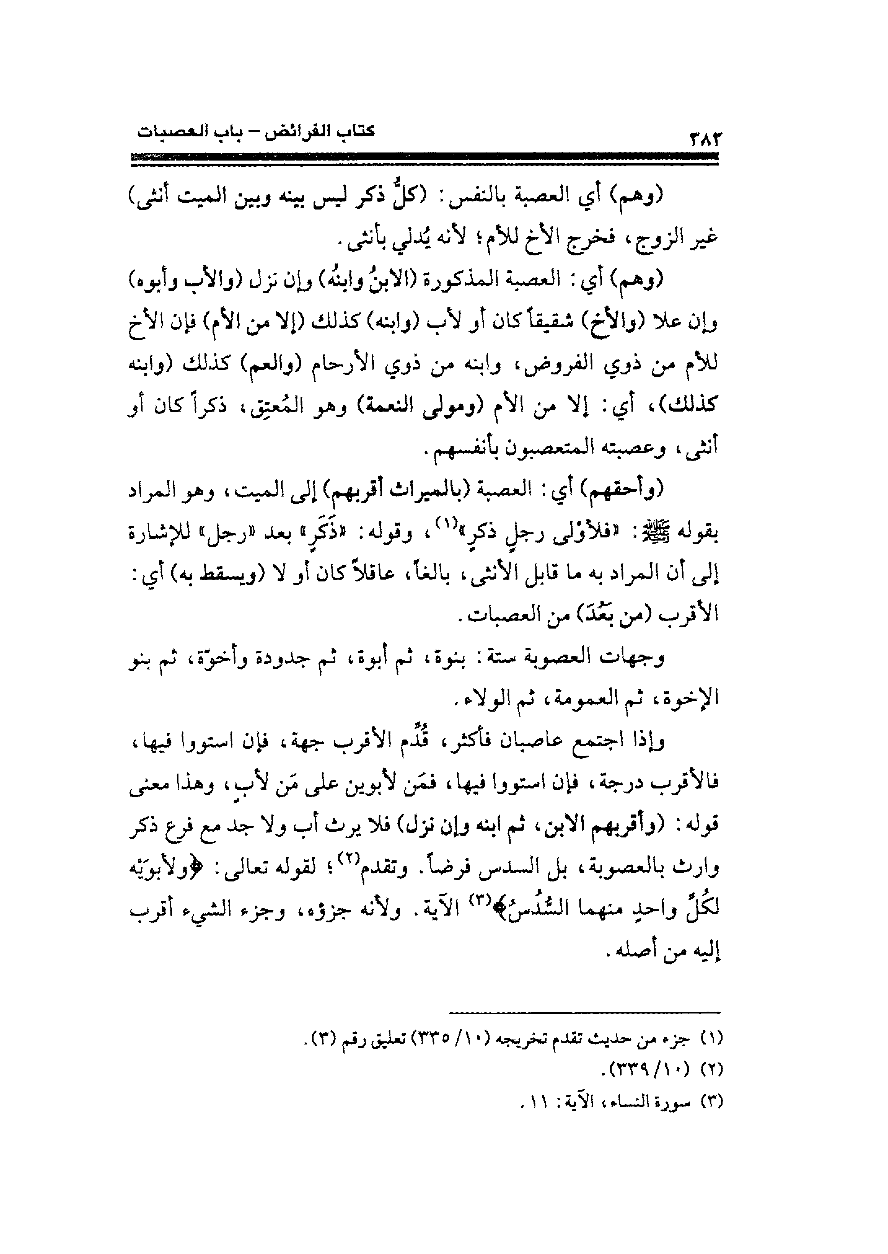 وإذا اجتمع عاصبان فأكثر، قُدِّم الأقرب جهة، فإن استووا فيها، فالأقرب درجة، فإن استووا فيها، فمَن لأبوين على من لأبٍ، وهذا معنى قوله: (وأقربهم الابن، ثم ابنه وإن نزل) فلايرث أب ولا جد مع فرع ذكر وارث بالعصوبة، بل السدس فرضًا. وتقدم (¬٢)؛ لقوله تعالى. {وَلِأَبَوَيهِ لِكُلِّ وَاحِدٍ مِنْهُمَا السُّدُسُ} (¬٣) الآية. ولأنه جزؤه، وجزء الشيء أقرب إليه من أصله.